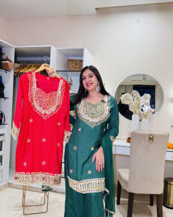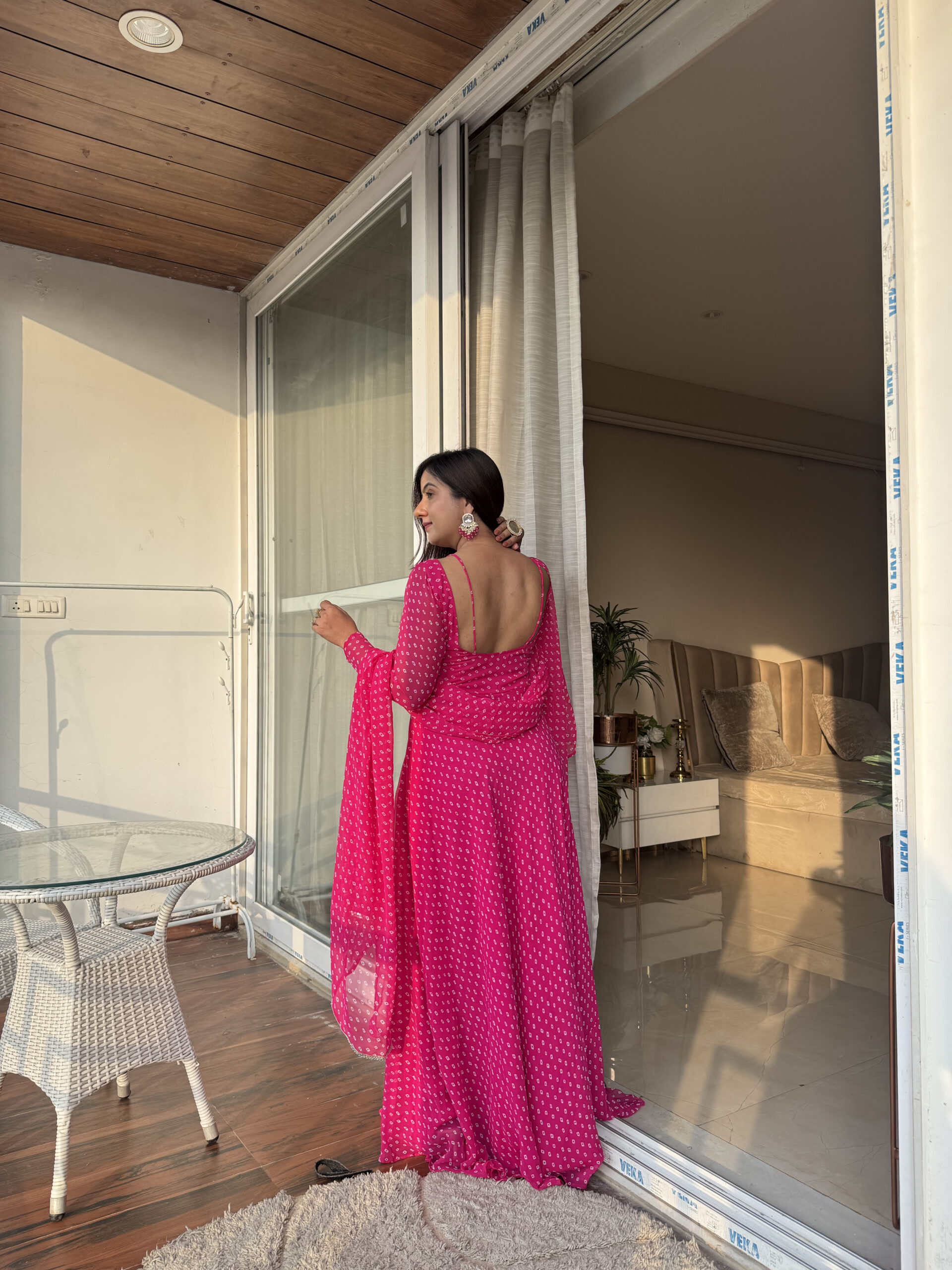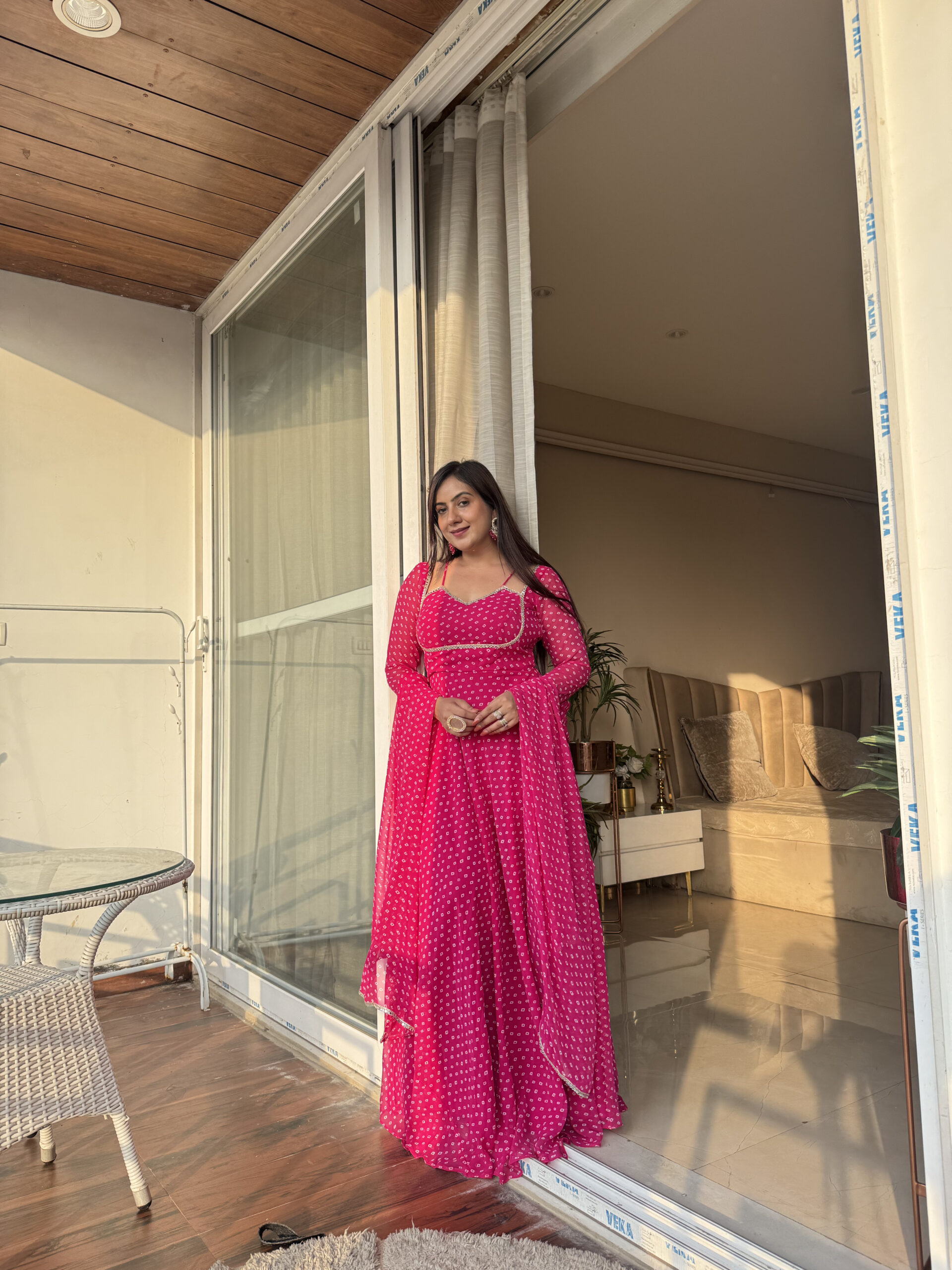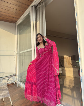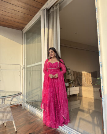 This Bandhani print Anarkali is the ultimate 2k25 festive trendsetter. Designed with a chic, trendy neckline and adorned with delicate mirror detailing on the neckline and dupatta, it brings together tradition with a modern twist. Flowing, vibrant, and oh-so-girly — it’s the perfect statement maker for any celebration.