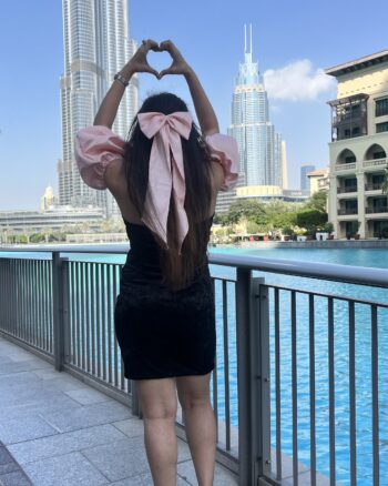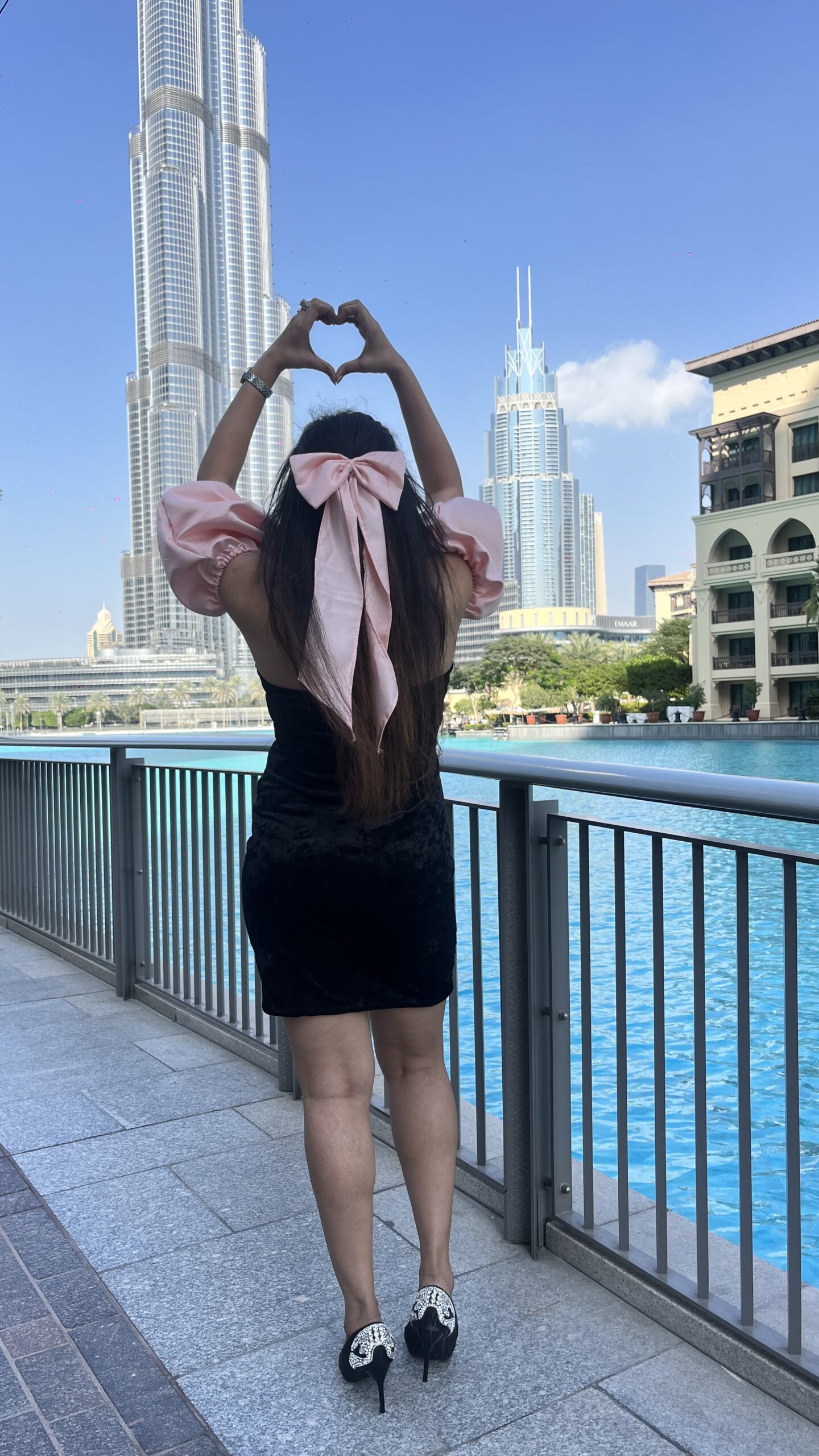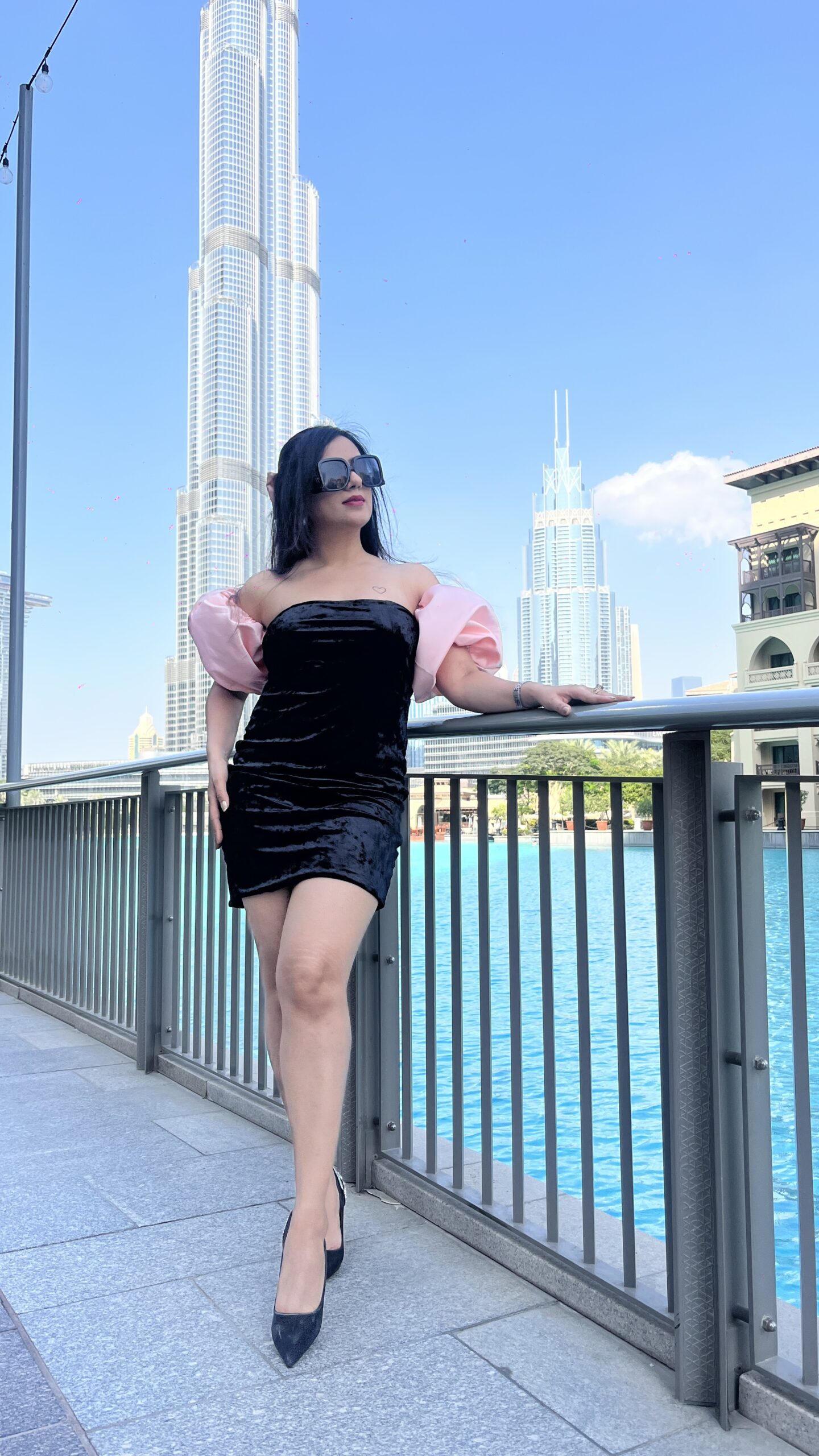 Black velvet mini dress with dramatic pink puff sleeves. A chic and playful outfit, ideal for parties and stylish nights out.