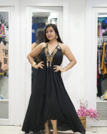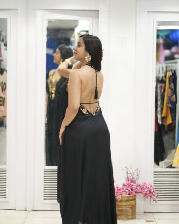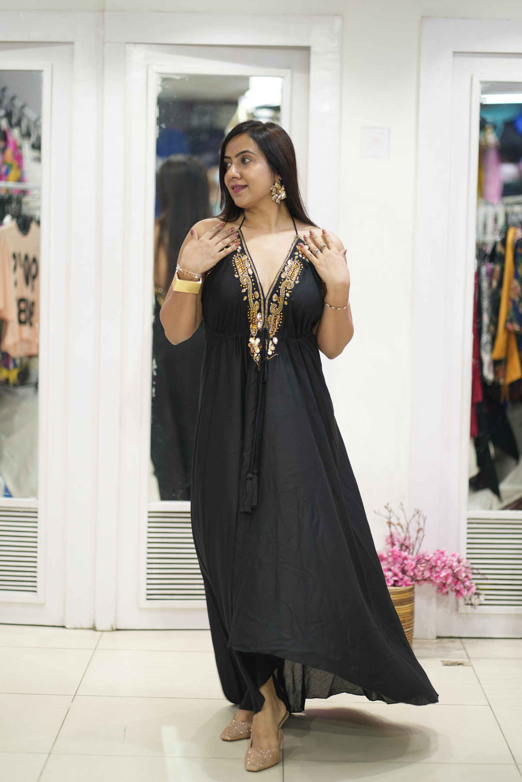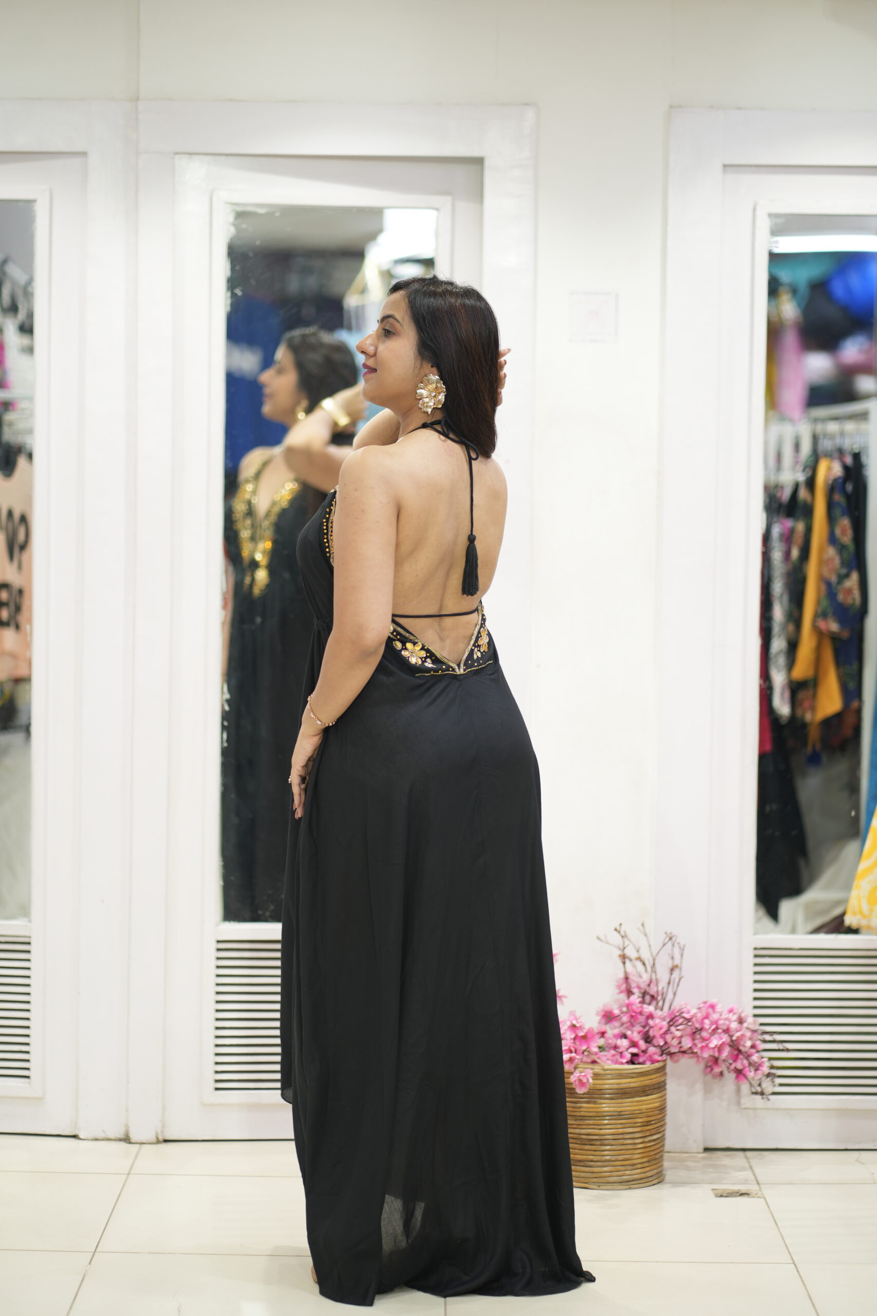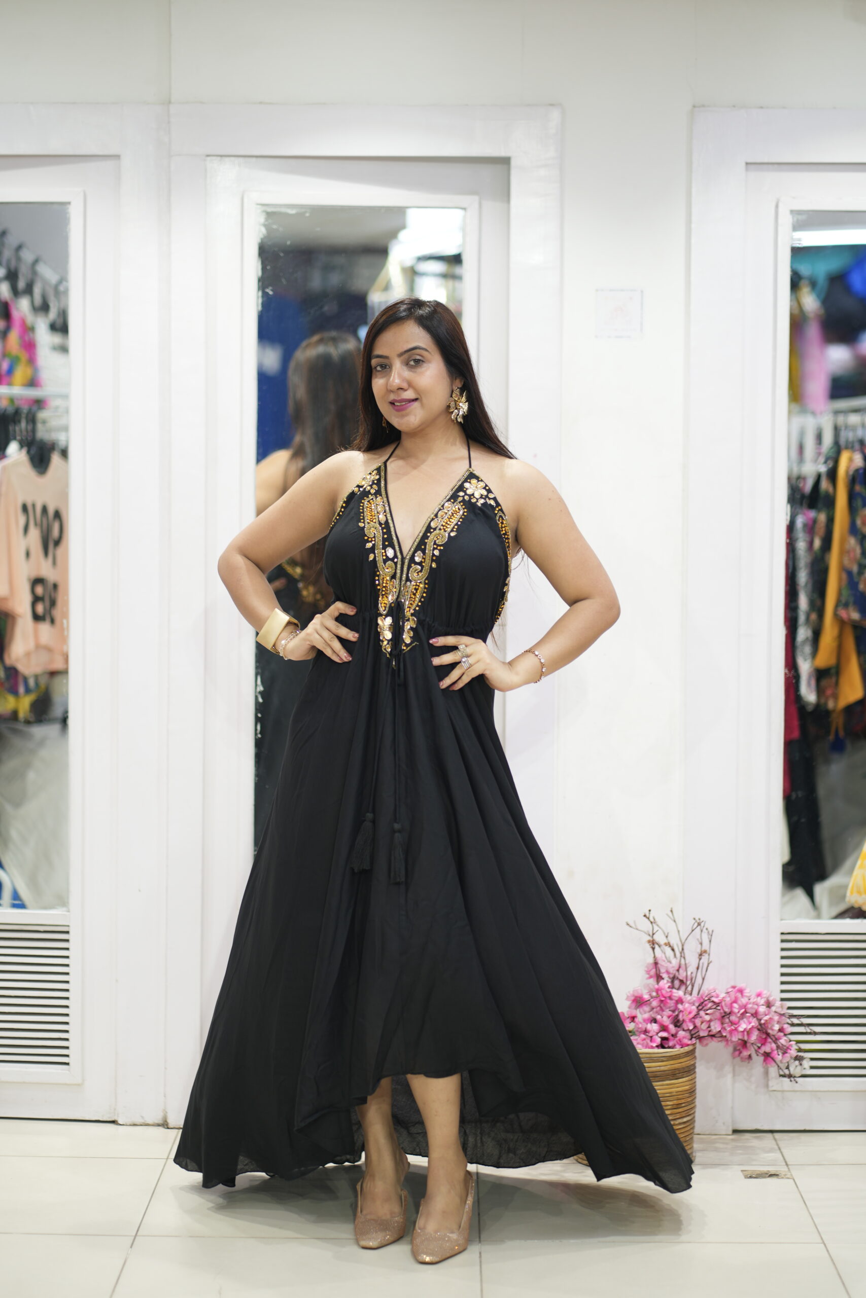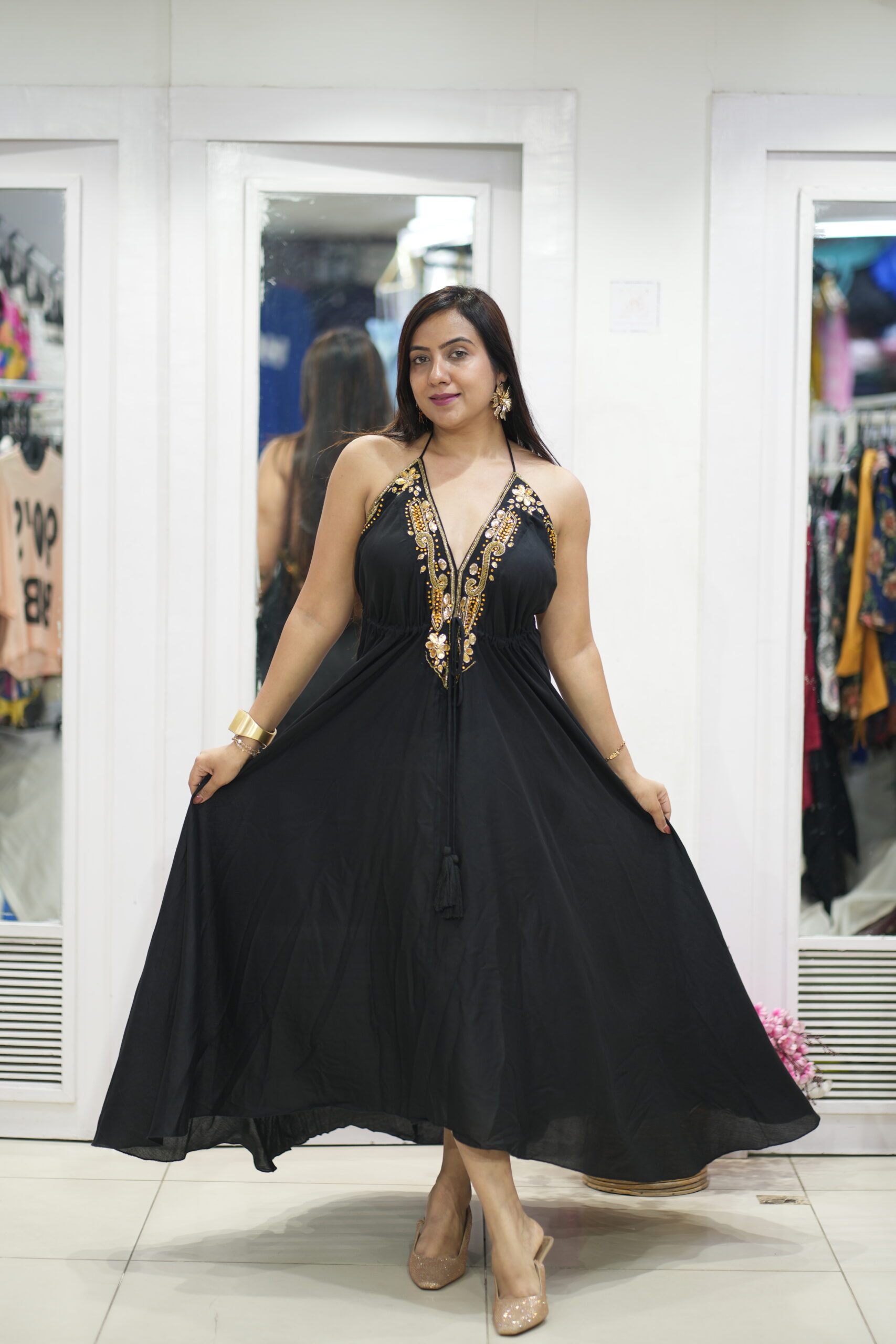 Black halter maxi with golden sequin work — perfect for vacation and beachside parties,Arabic event like dessert safari
