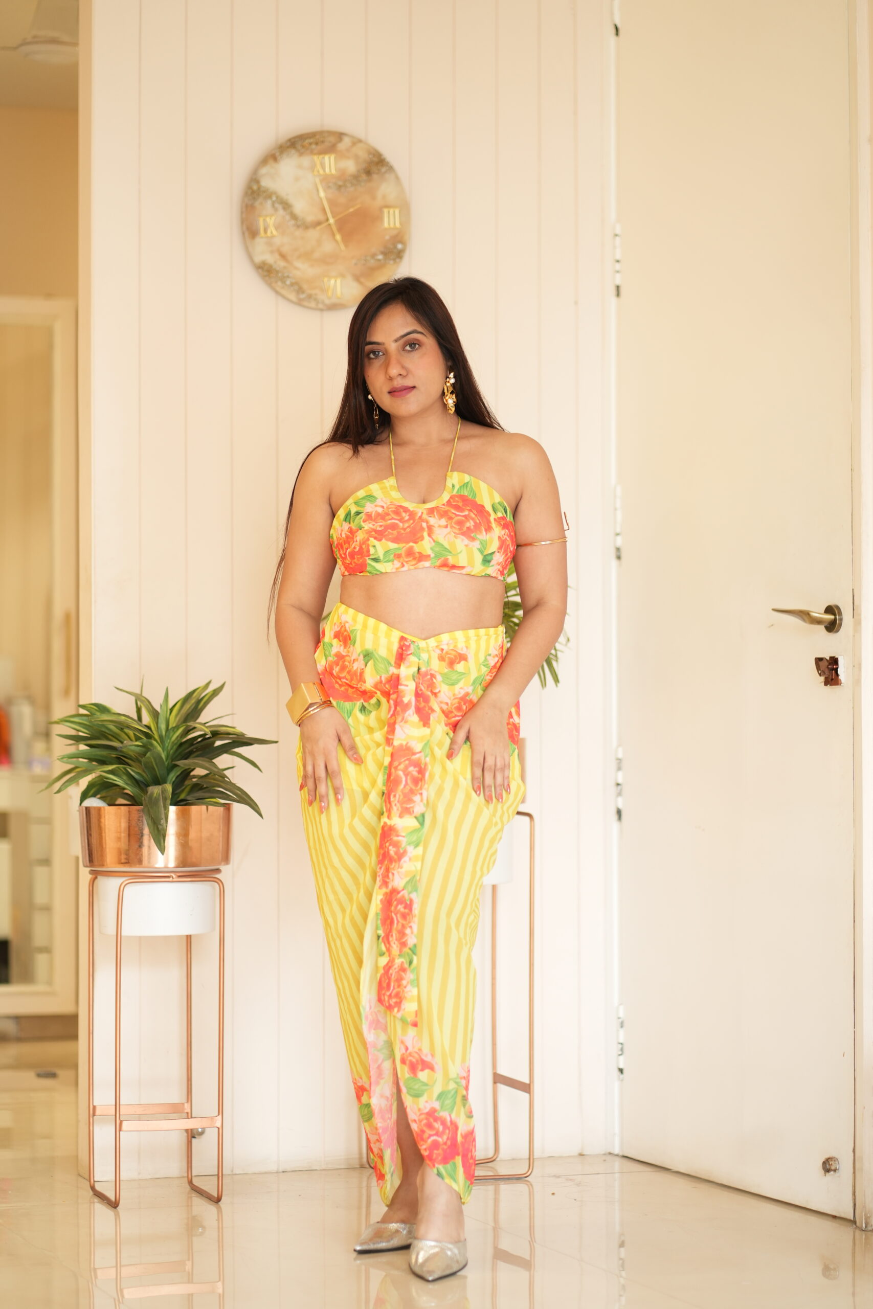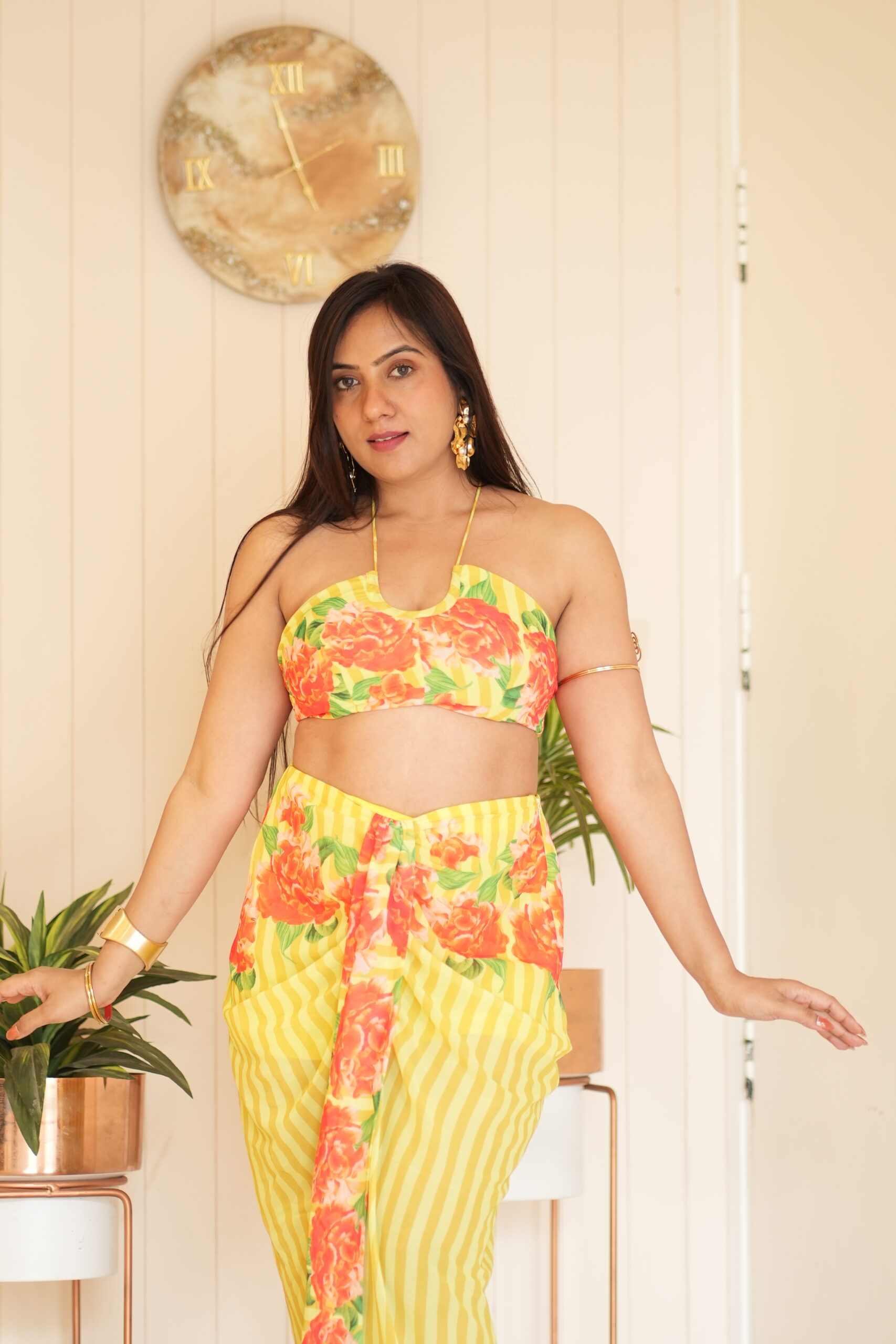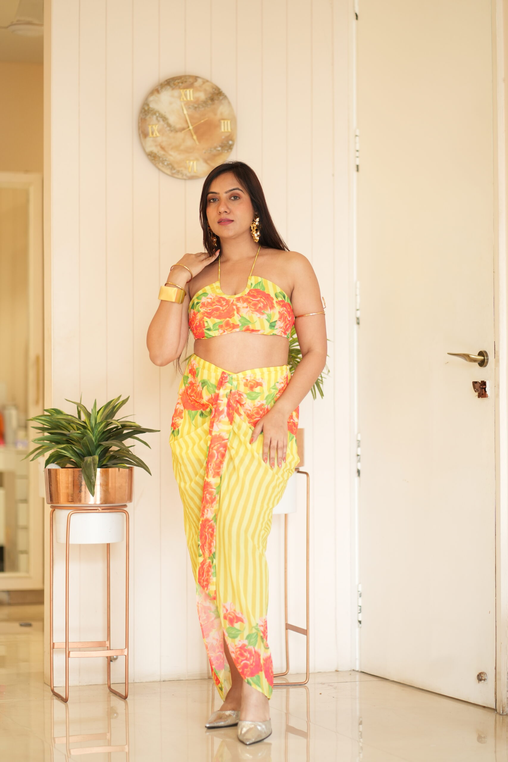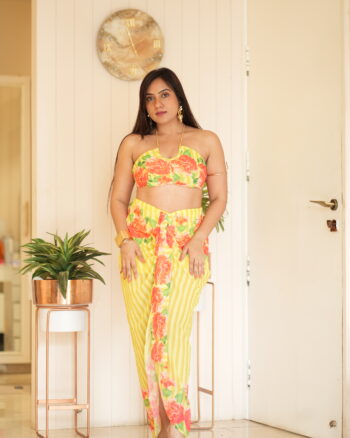 A neon-bright vacation set with a pure chiffon backless top and drape-style skirt in our customised floral print. Playful, fun, and perfect for holiday vibes.