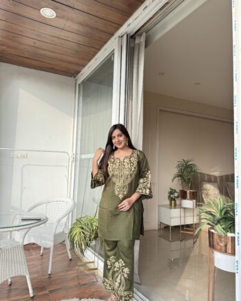 Classy olive green suit with very fine embroidery, designed with a trendy belly-bottom style that creates a stunning statement. The festive olive shade makes it a perfect pick for elegant celebrations.