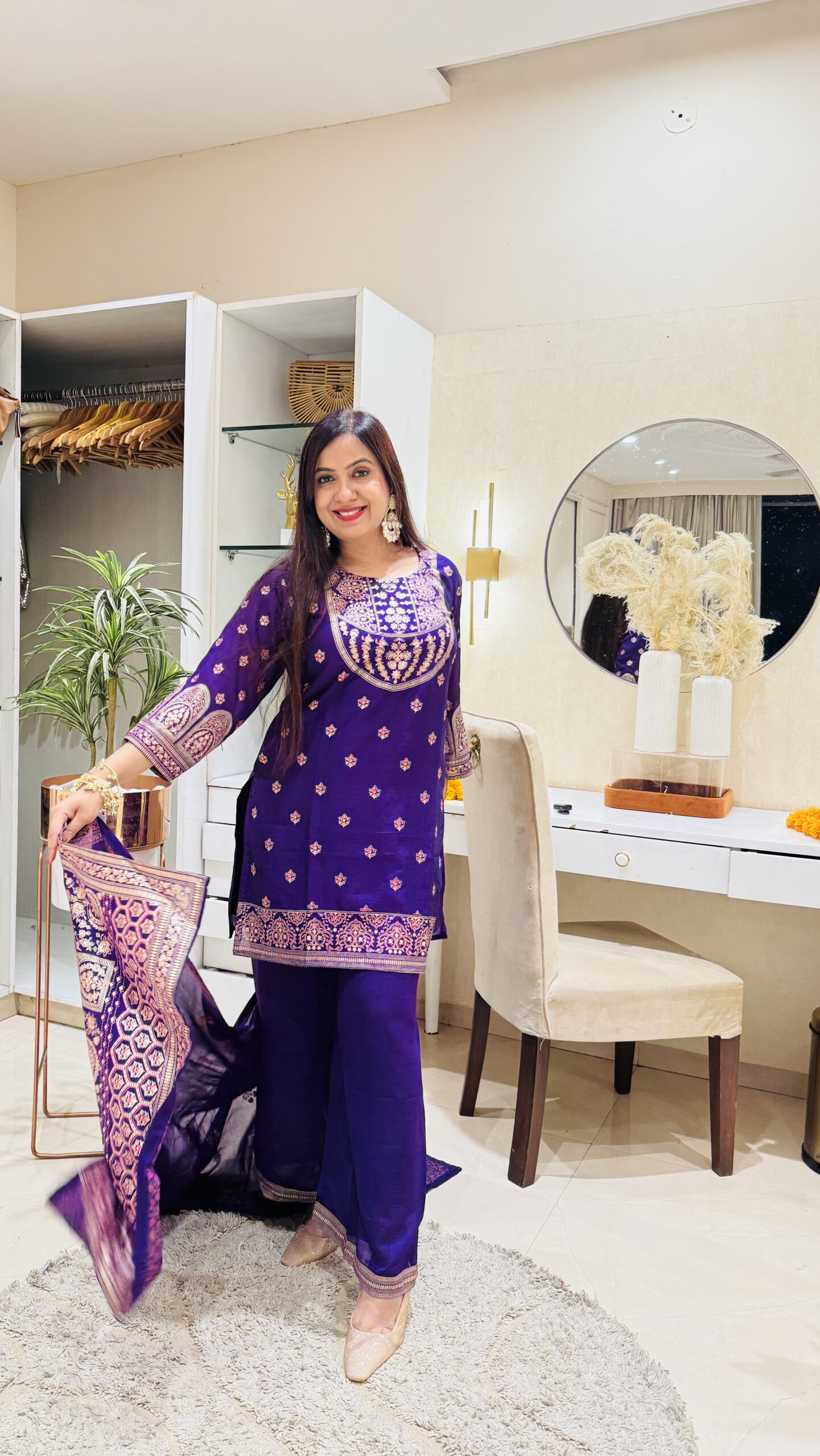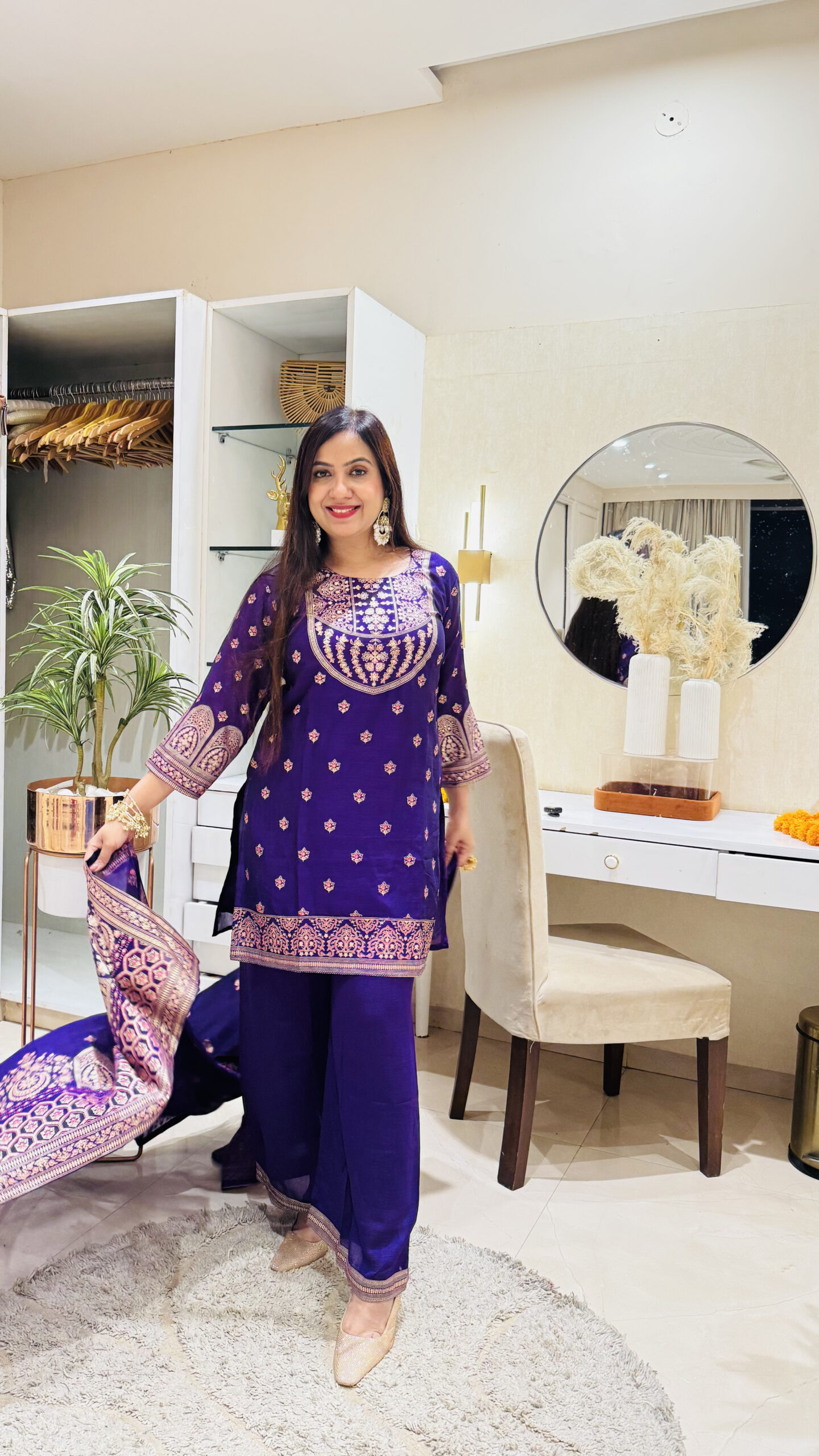 Soft and lightweight silk cord set, designed for both comfort and elegance. The outfit can be styled as a chic cordset, featuring delicate hand-painted detailing on the suit for a refined festive touch.