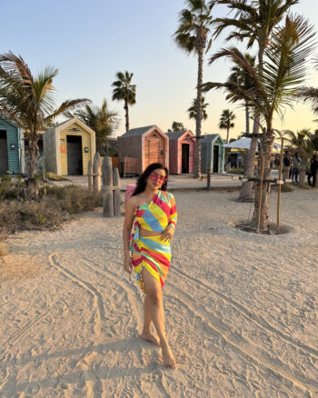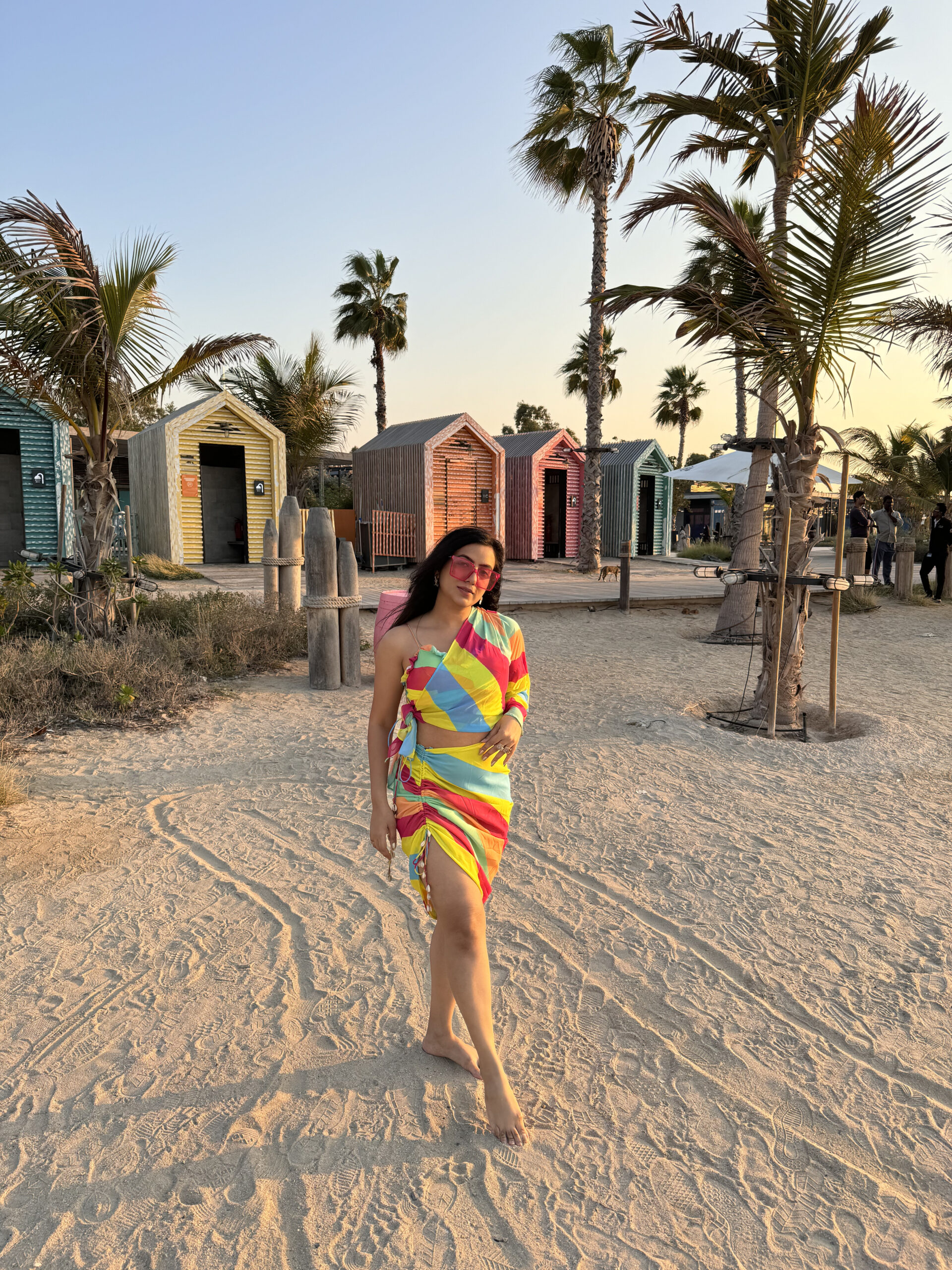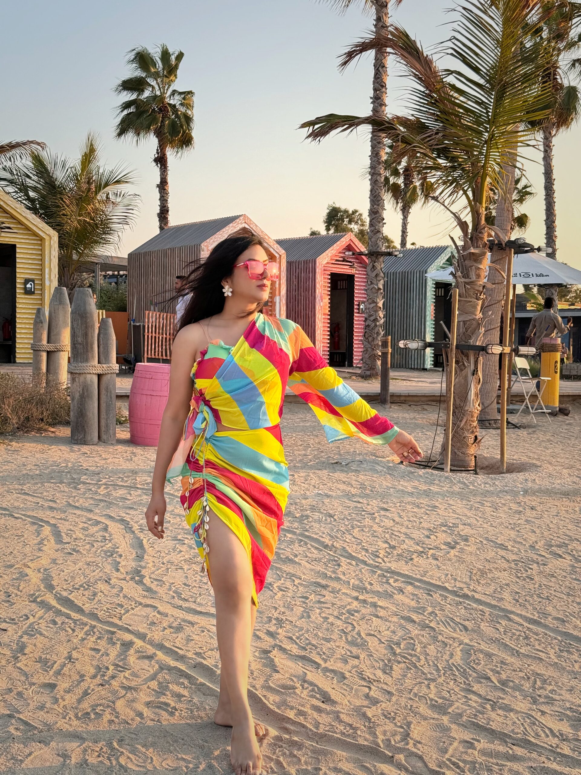 Playful rainbow one-shoulder dress in pure chiffon. Light, breezy, and perfect for beach walks, photoshoots, and vacay vibes.”