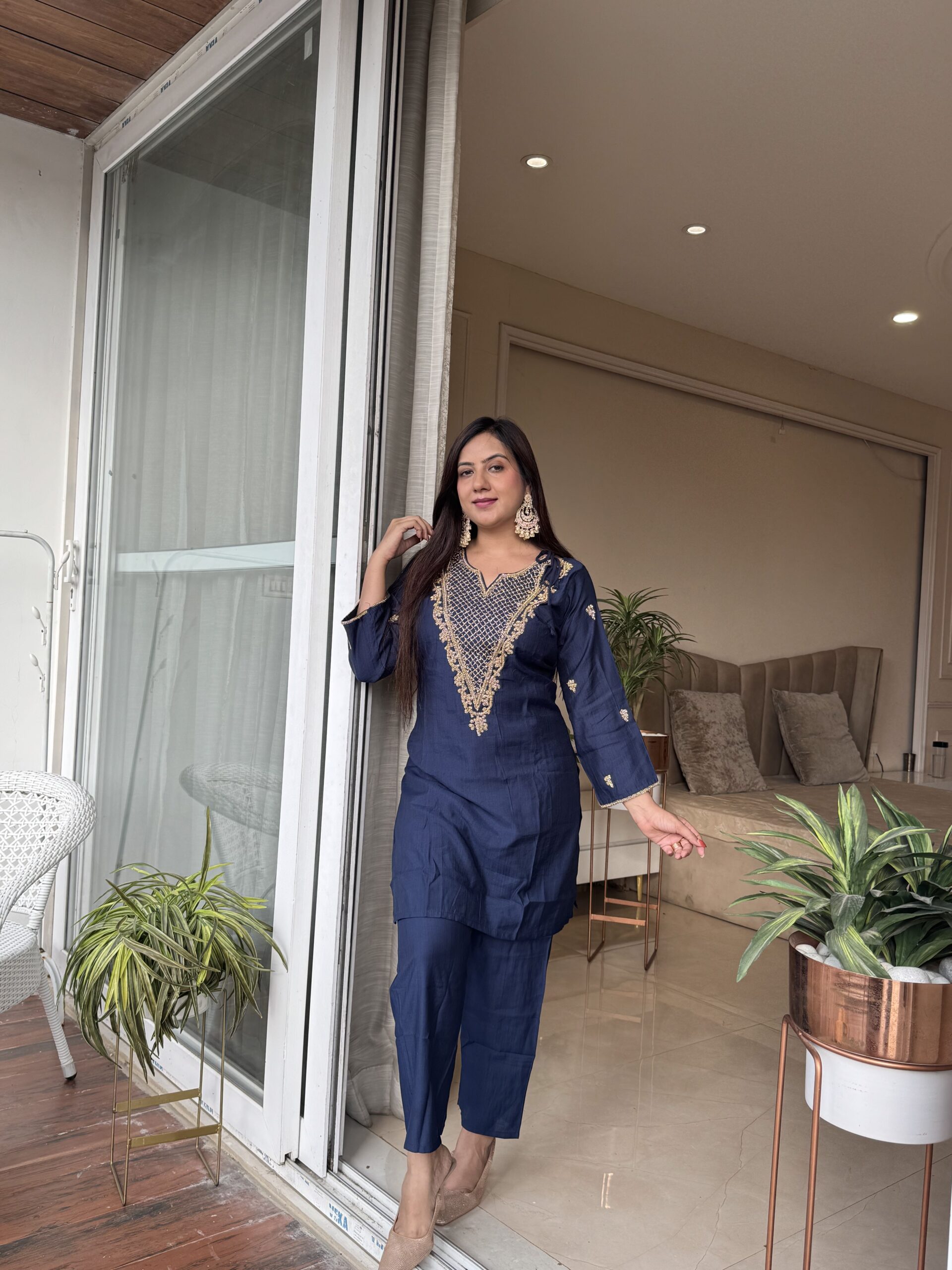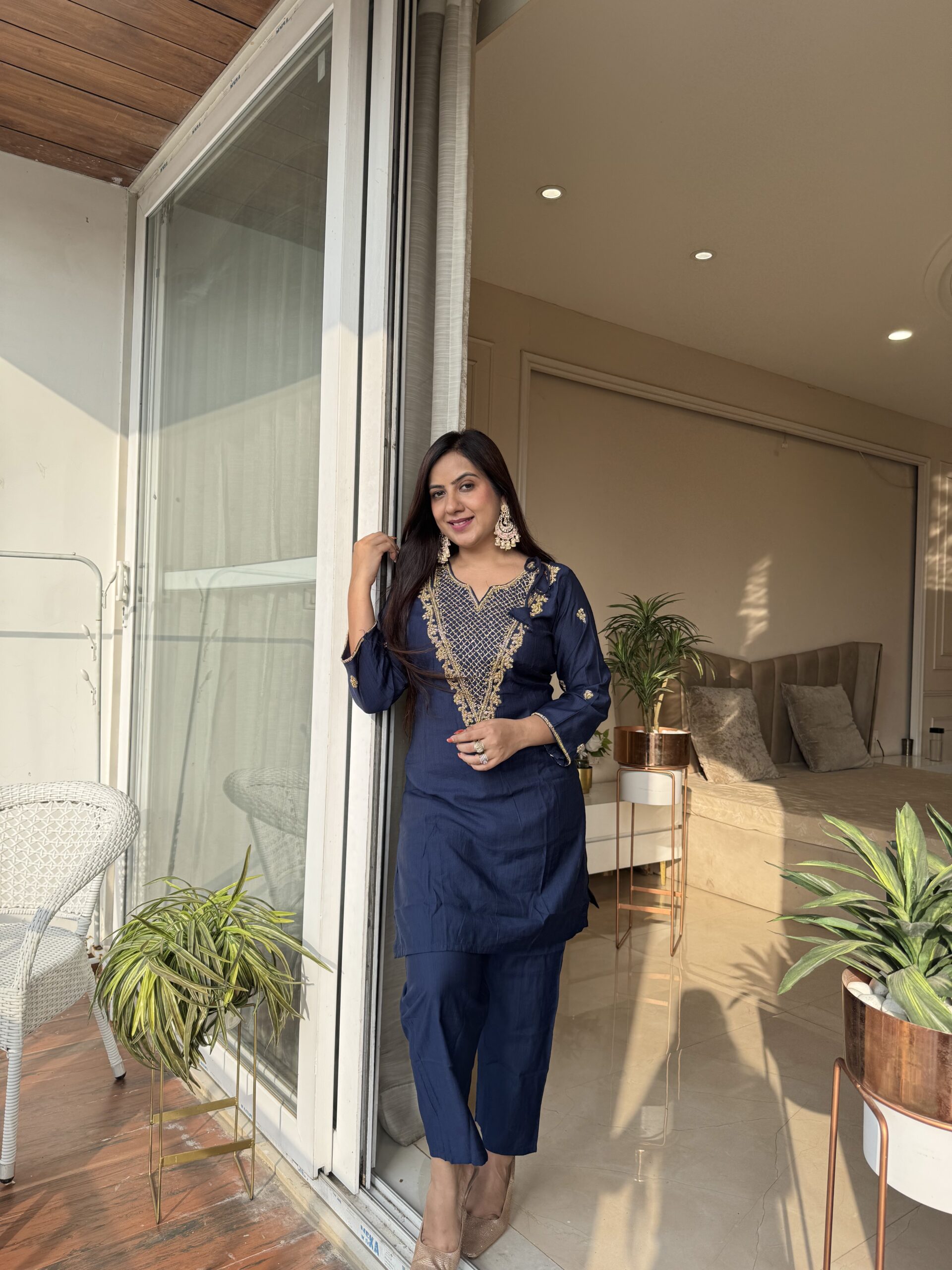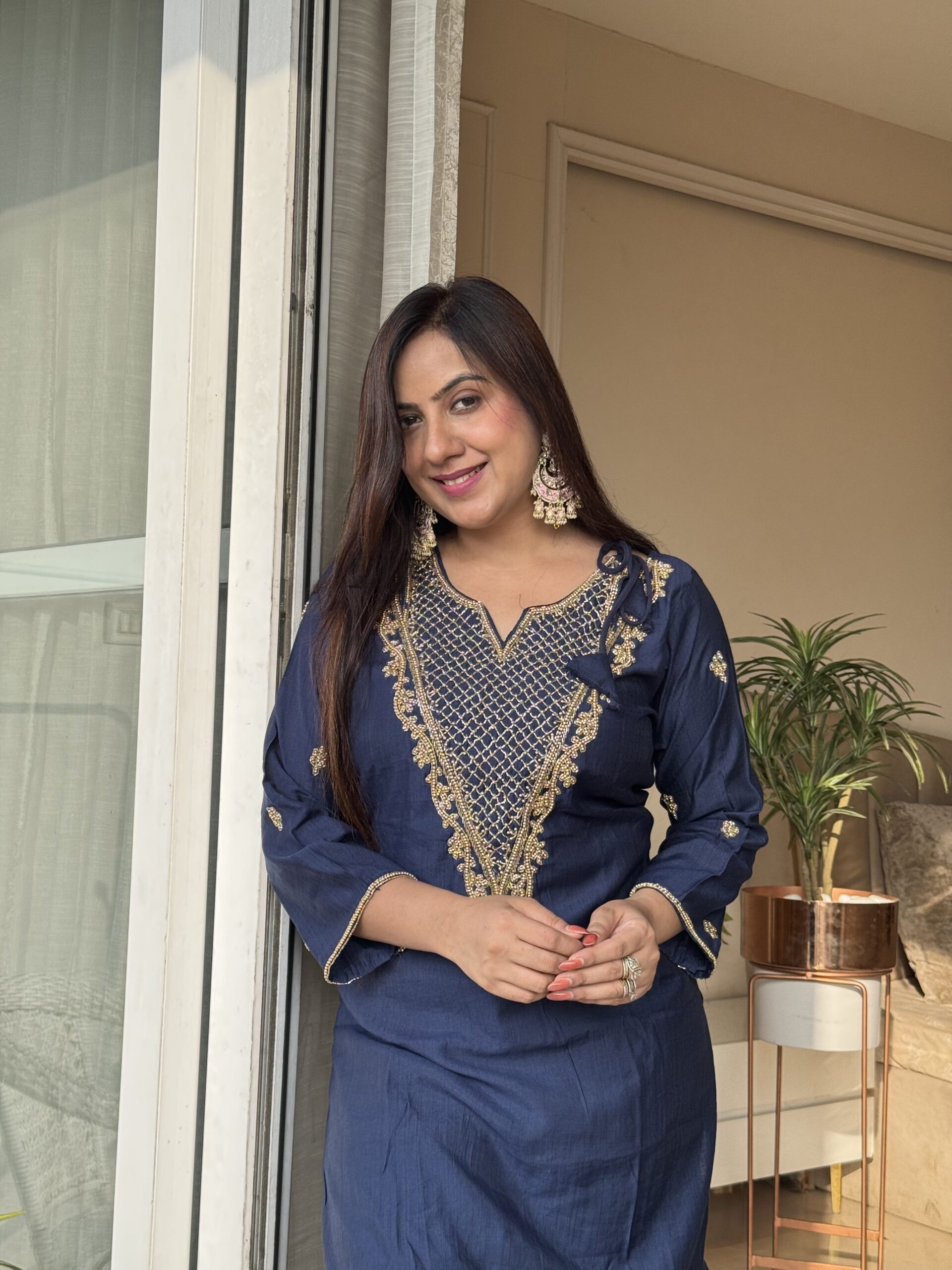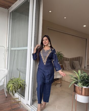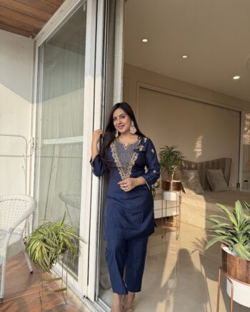 Beautiful hand-embroidered detailing, giving the perfect festive vibes. The deep navy shade enhances the golden handwork even more, making it elegant and timeless. Crafted in pure rayon silk for a luxurious feel and effortless comfort.