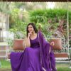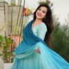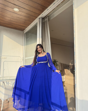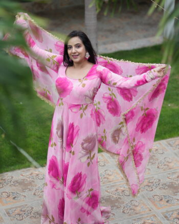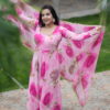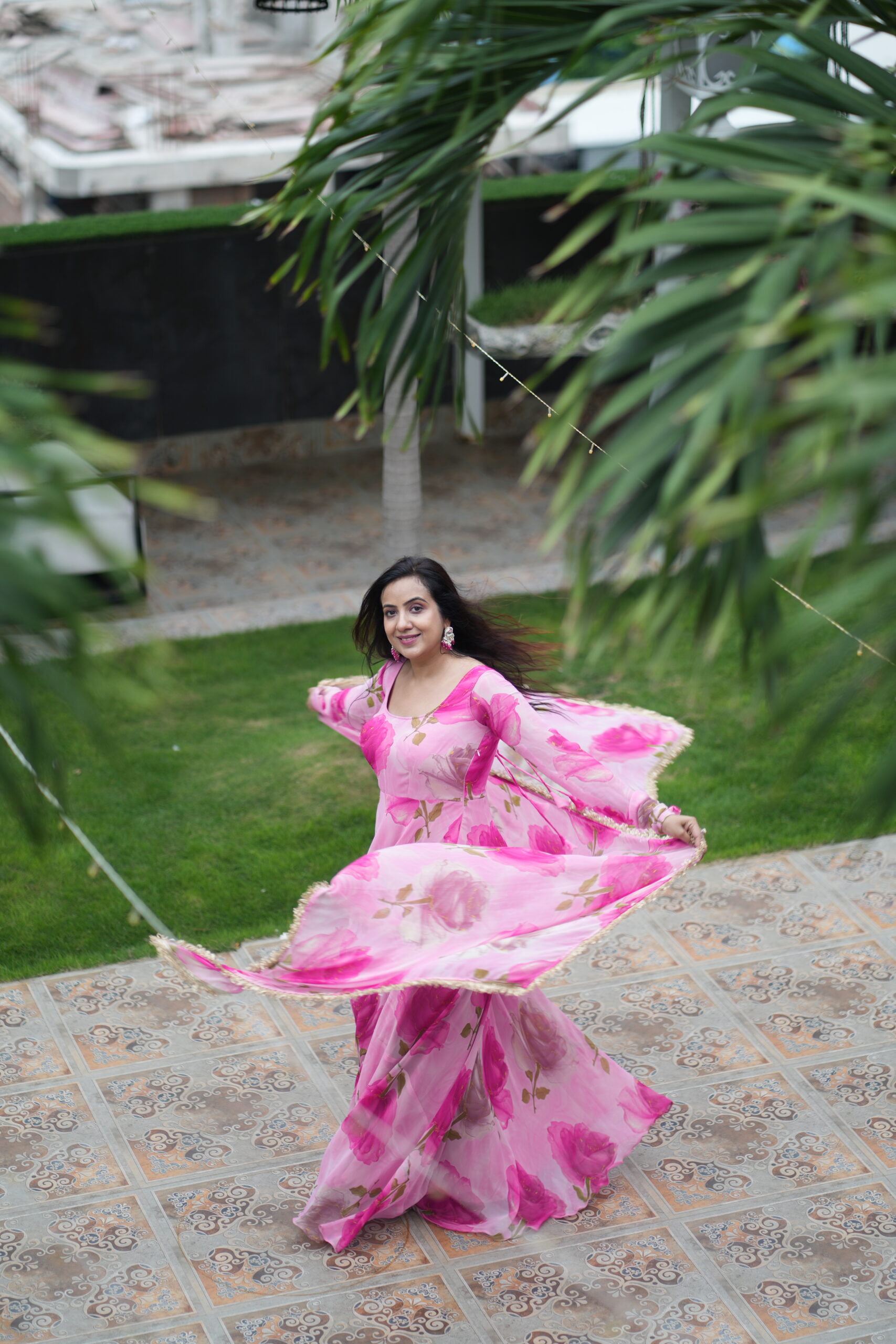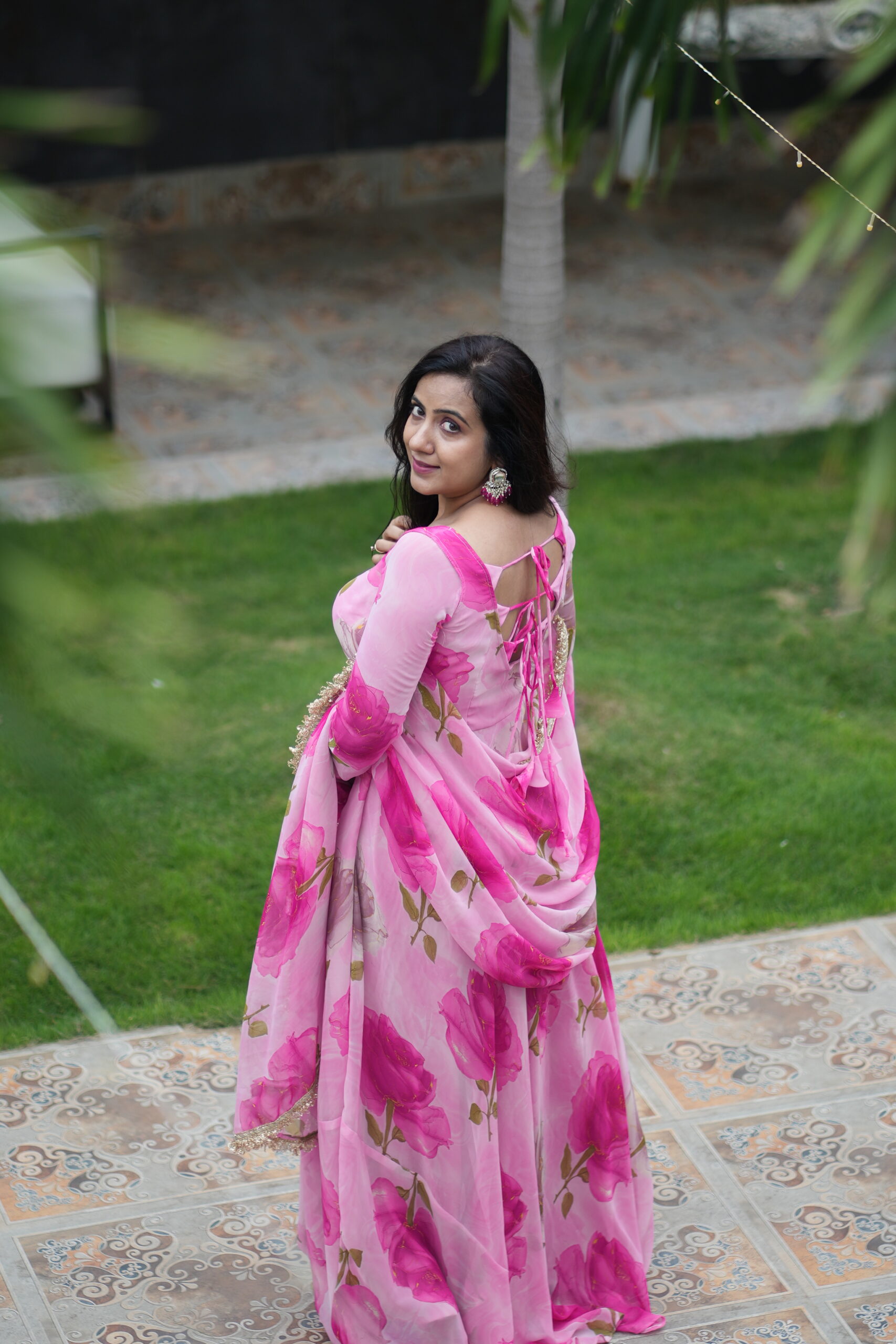 Soft chiffon dress with bright pink floral prints and golden lace, full of festive charm.