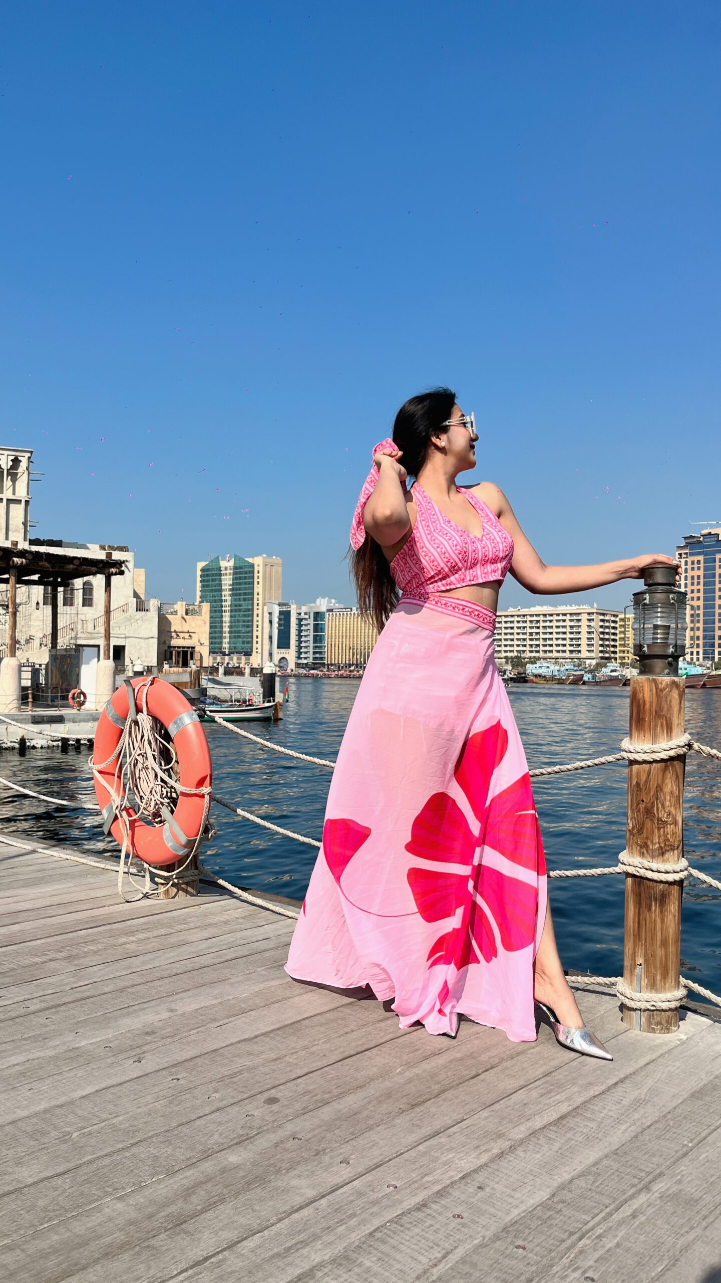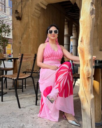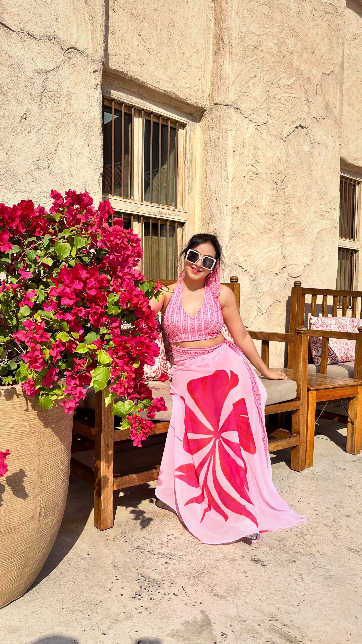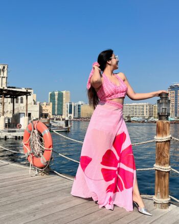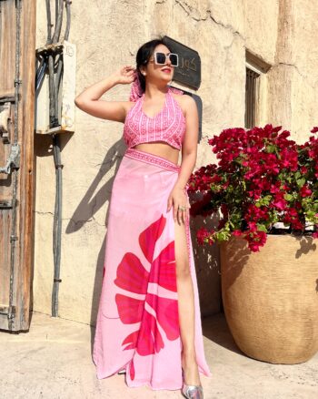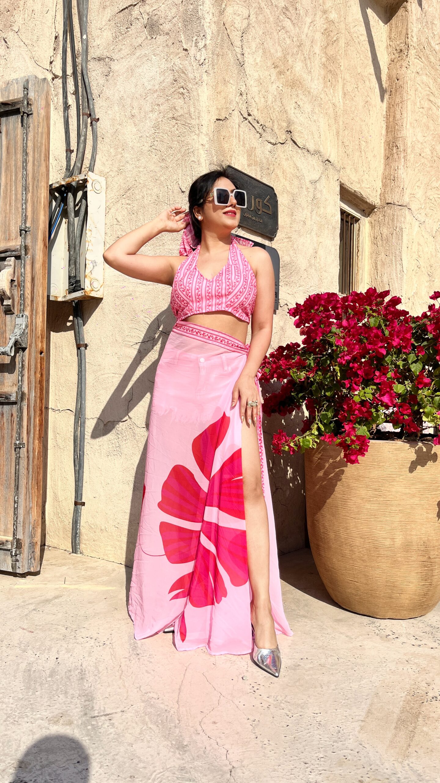 Halter bralette with slit wrap skirt in vibrant pink tones — perfect for sunny vacation days and stylish resort shoots.