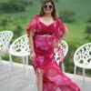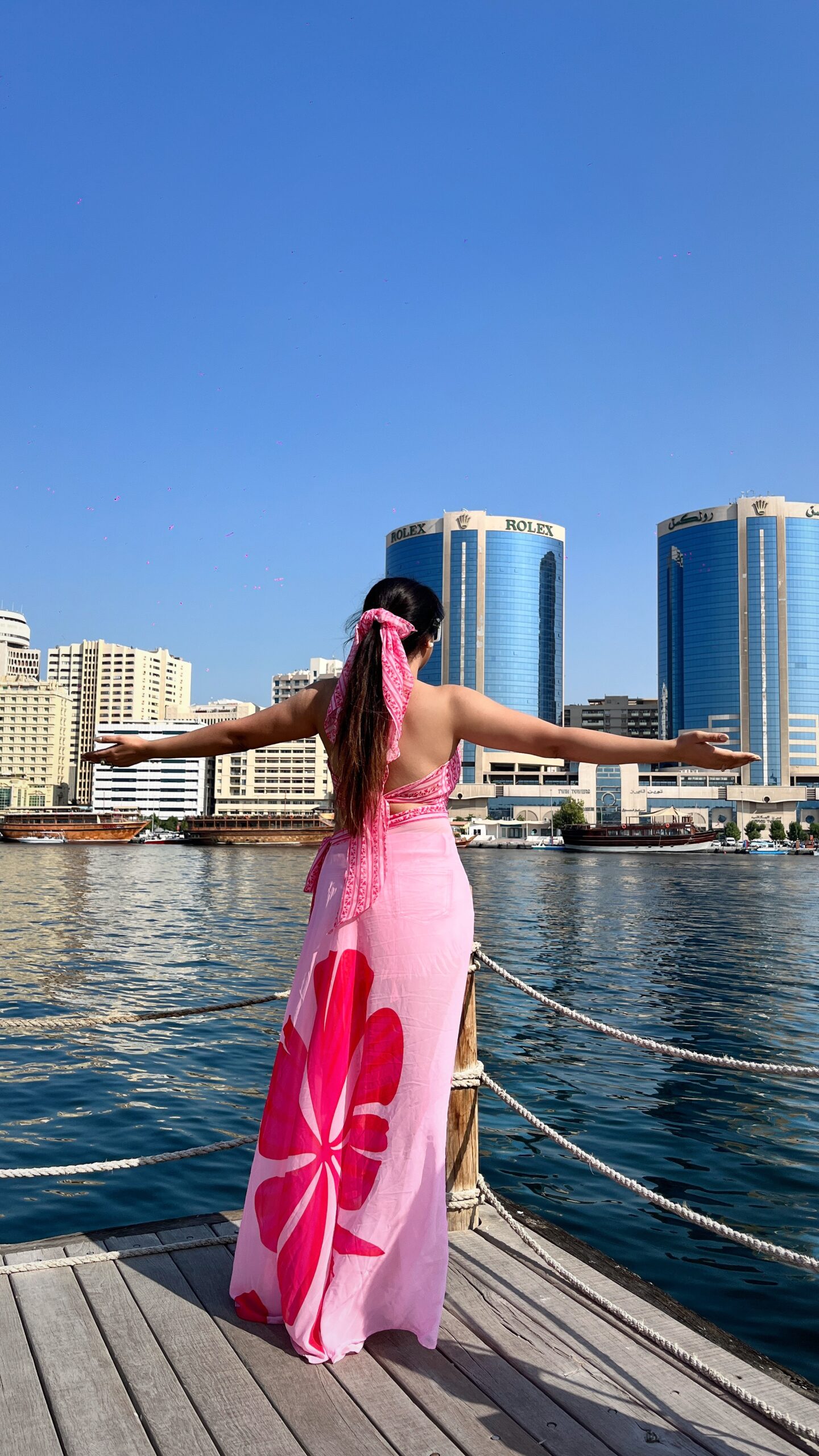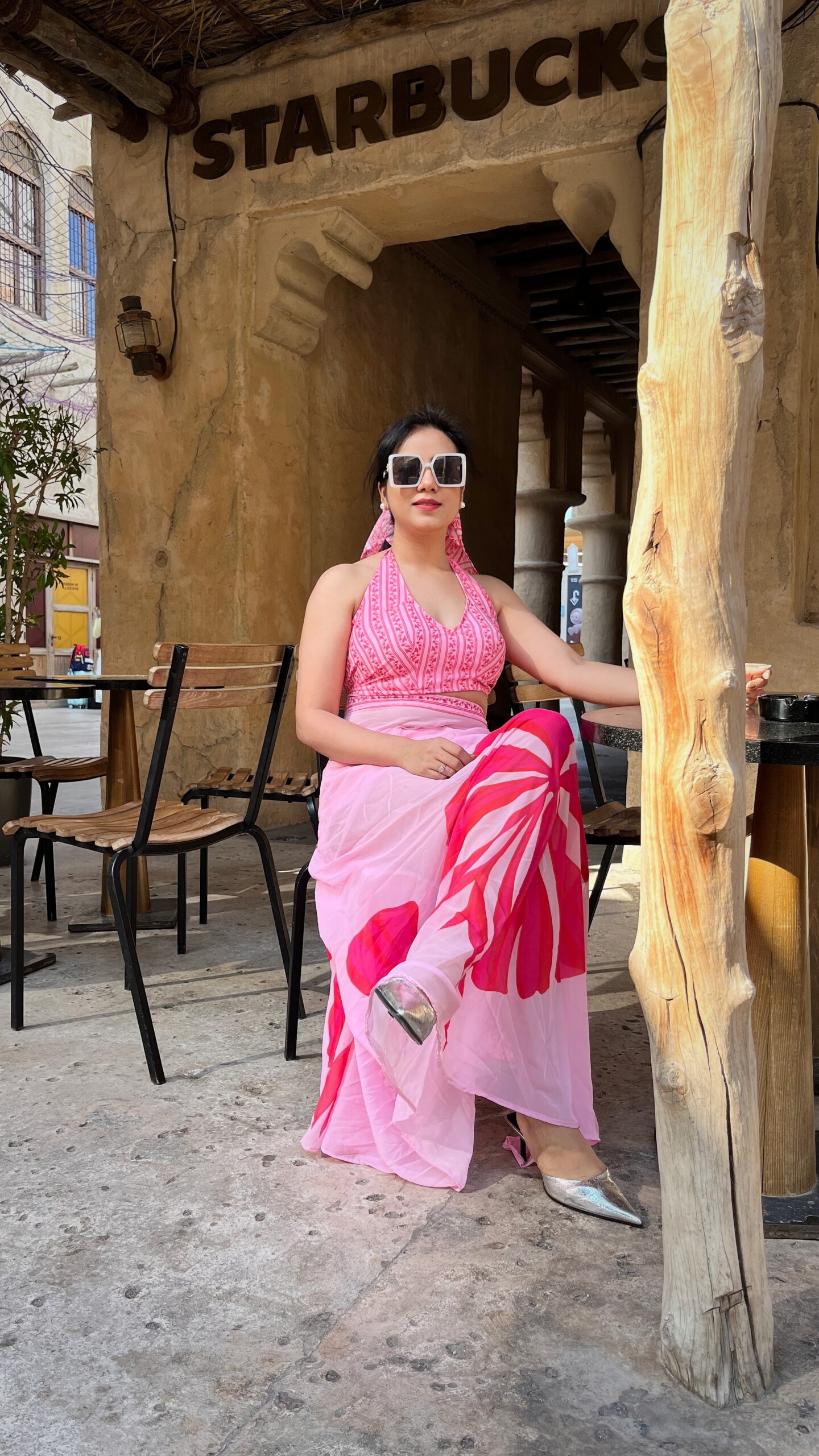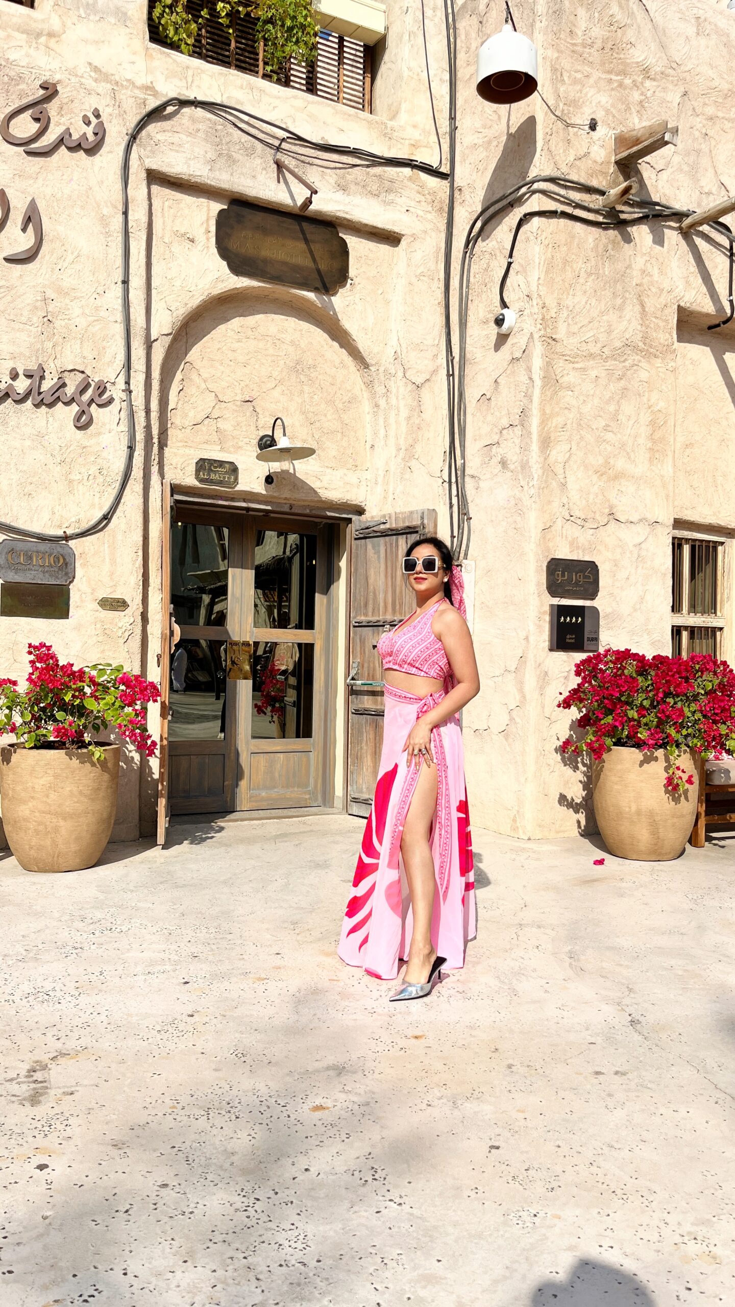Halter bralette with slit wrap skirt in vibrant pink tones — perfect for sunny vacation days and stylish resort shoots.