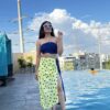 Navy bandeau with neon slit skirt in playful polka dots — perfect for pool parties and vacation vibes .imported fabric perfect for pool vibes