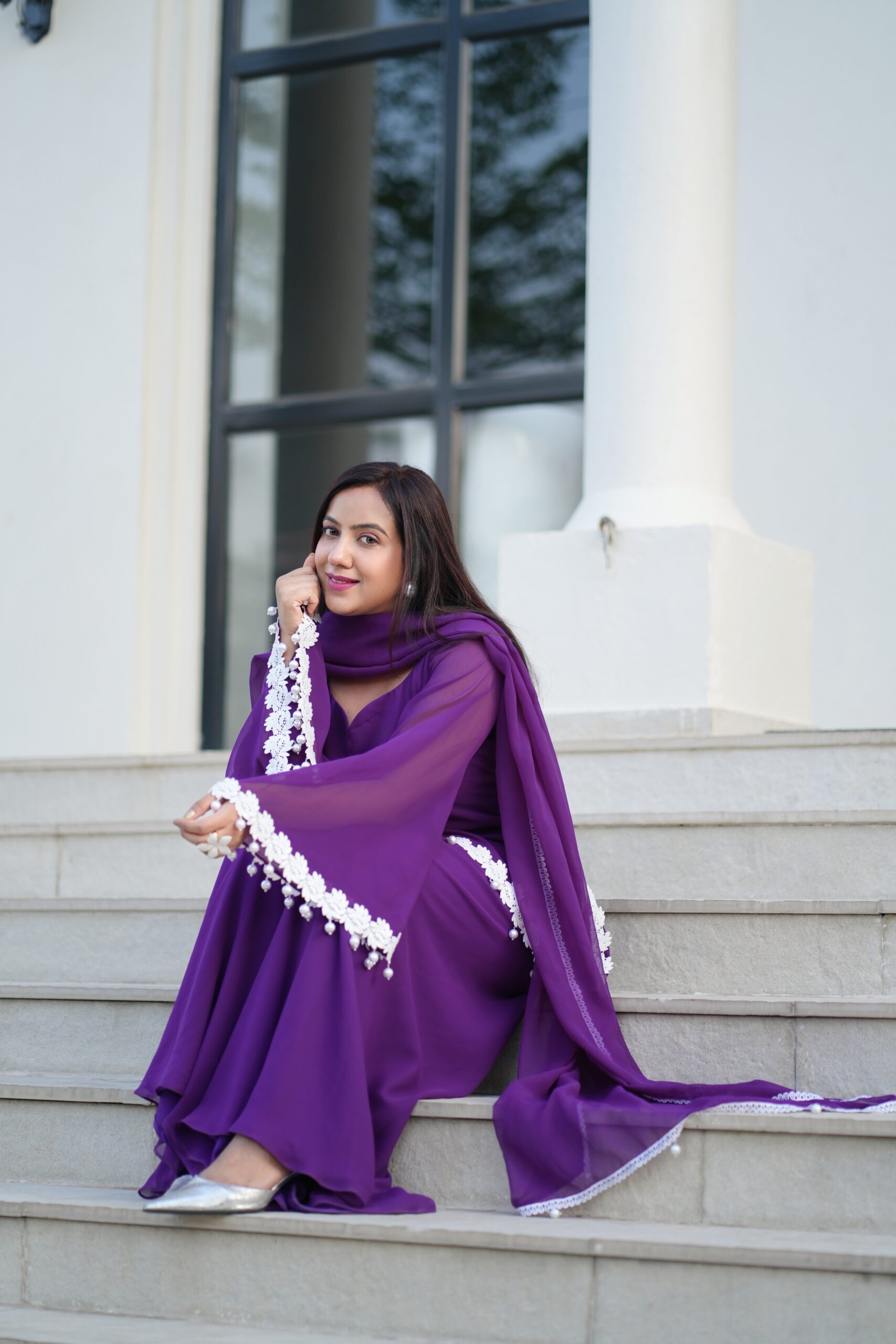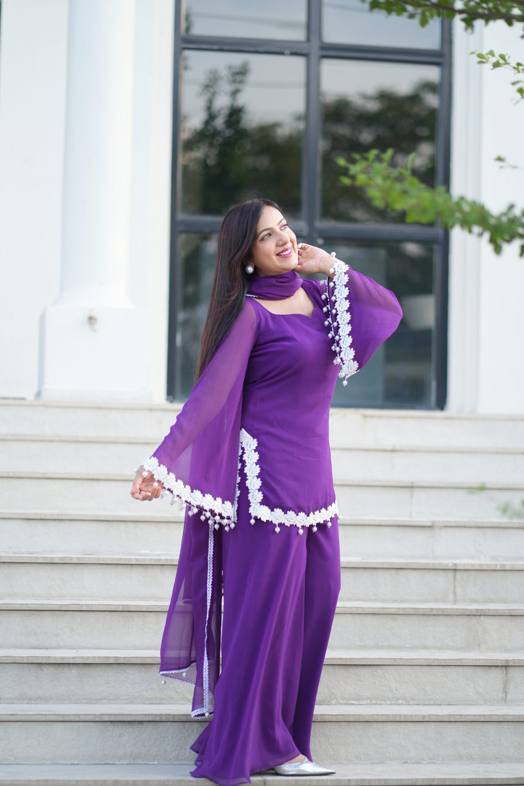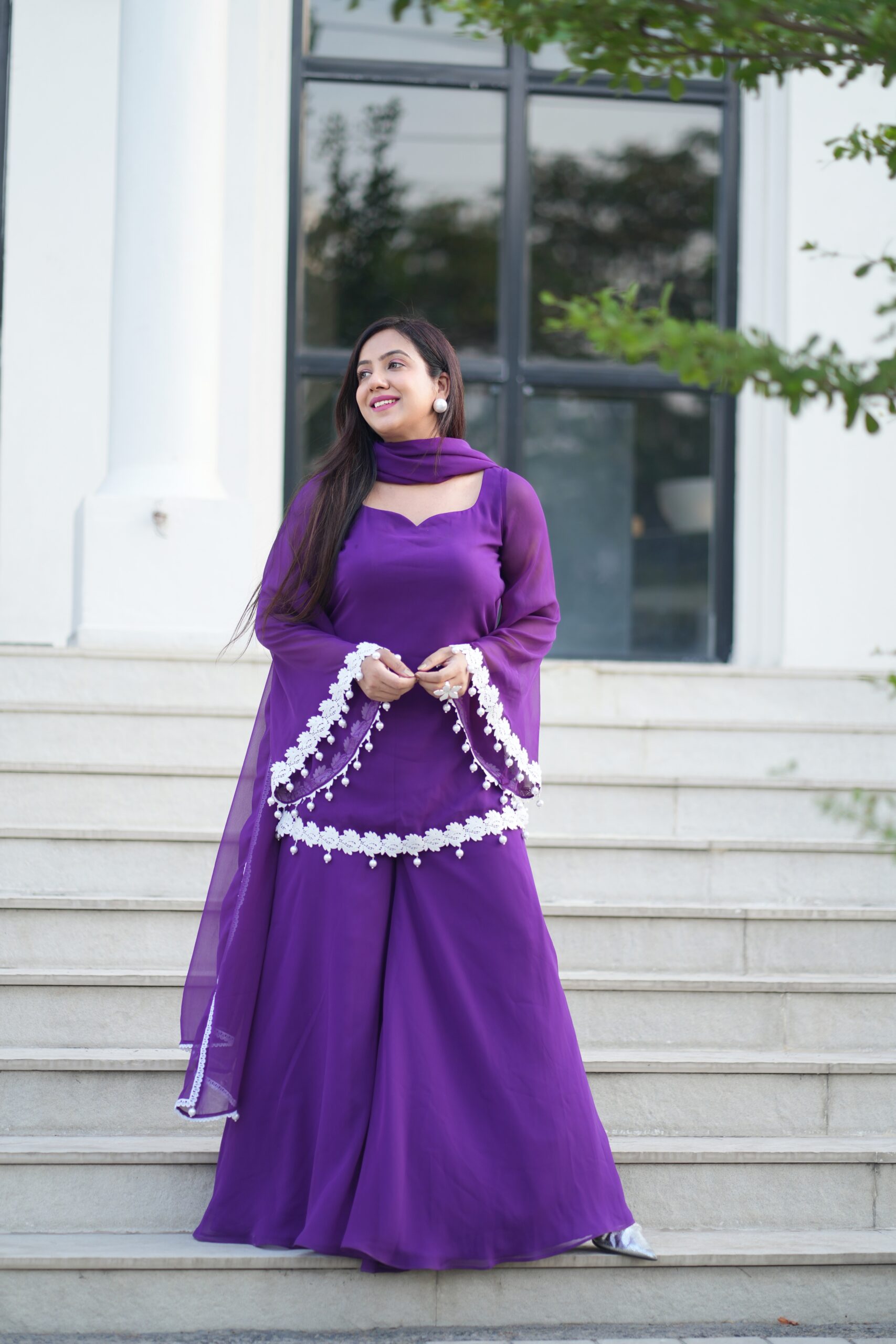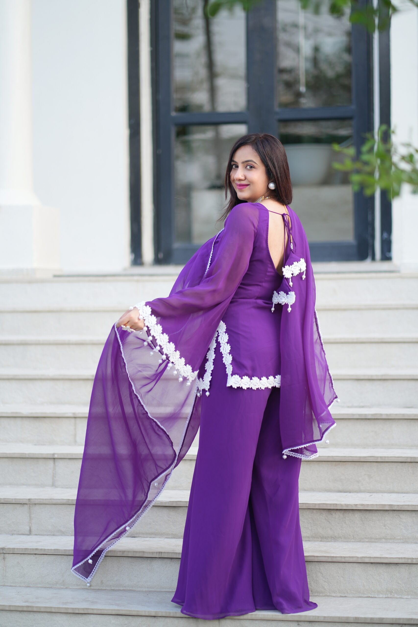 Elegant purple suit with white floral lace beautiful back detailing — perfect for festive and graceful looks.
