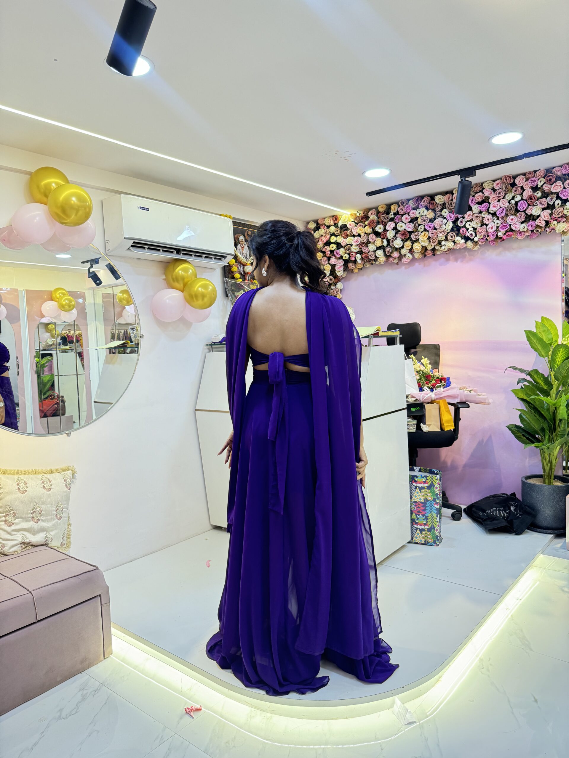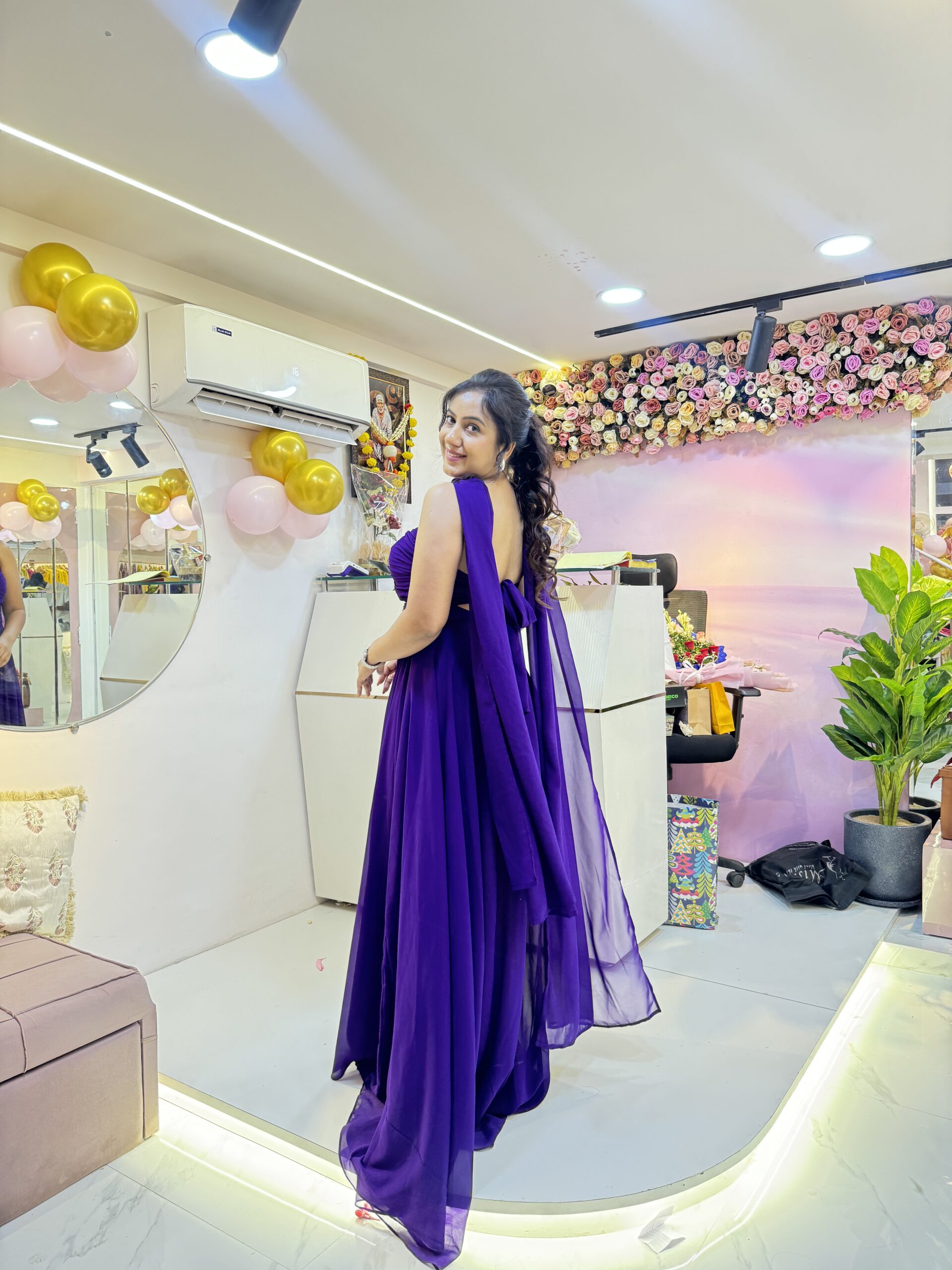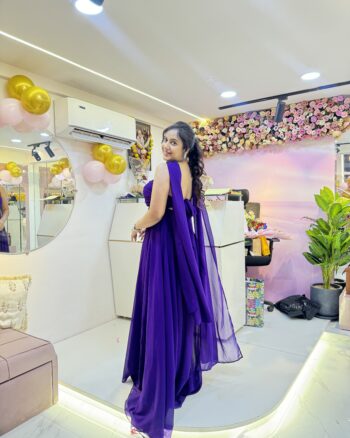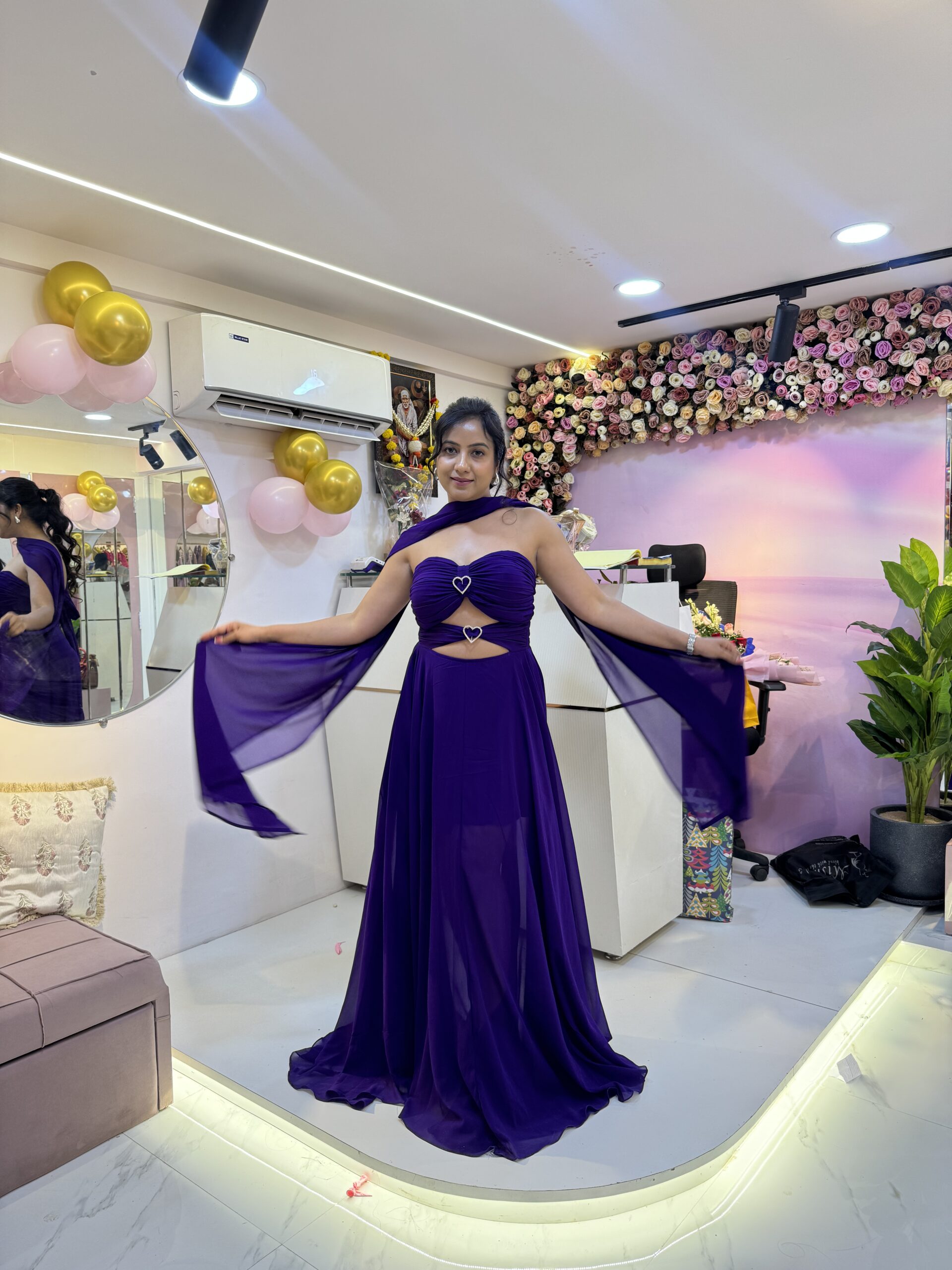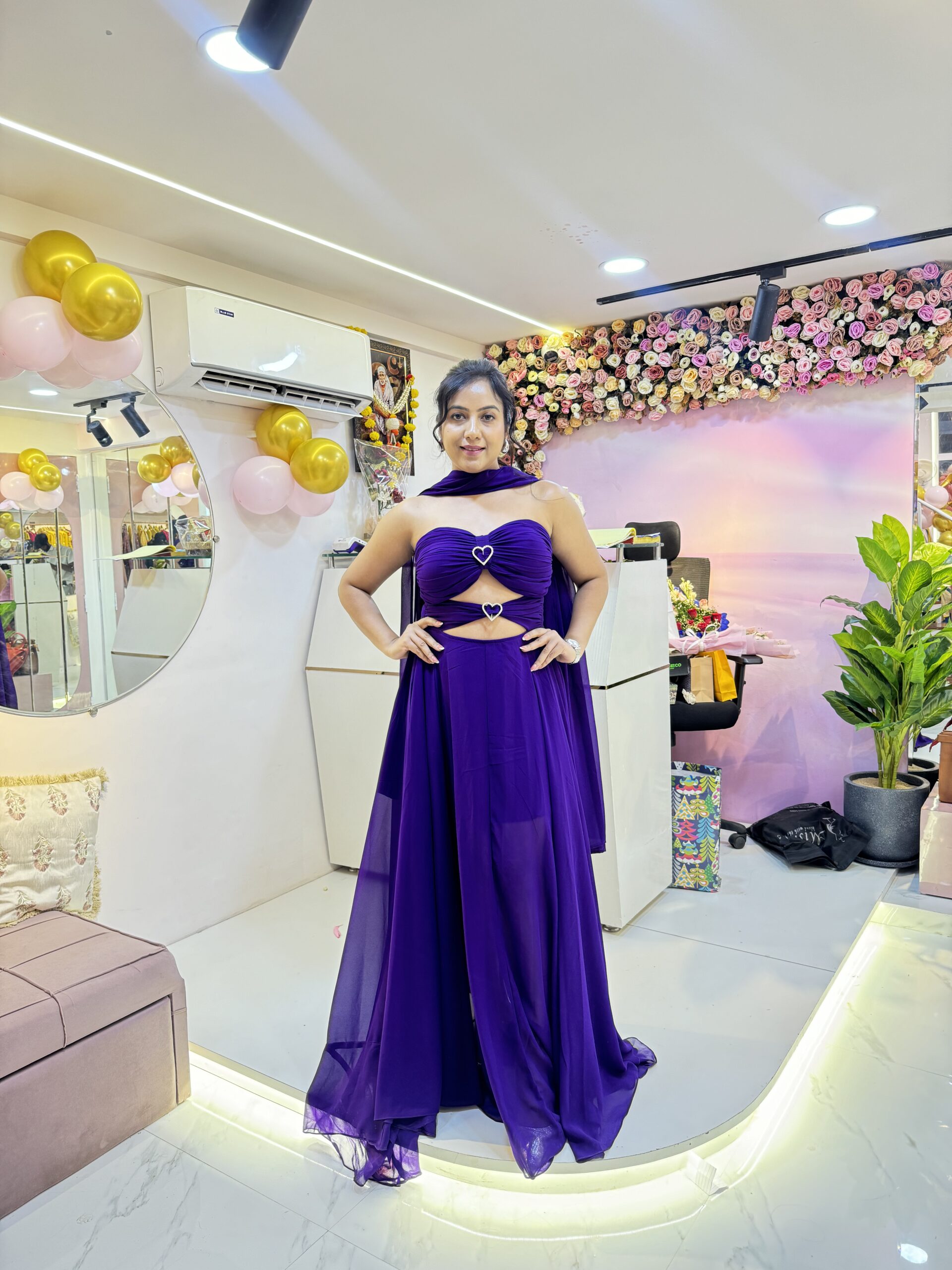 Stunning purple gown with heart detail and flowing flare — perfect for glamorous vacation evenings and photoshoots.