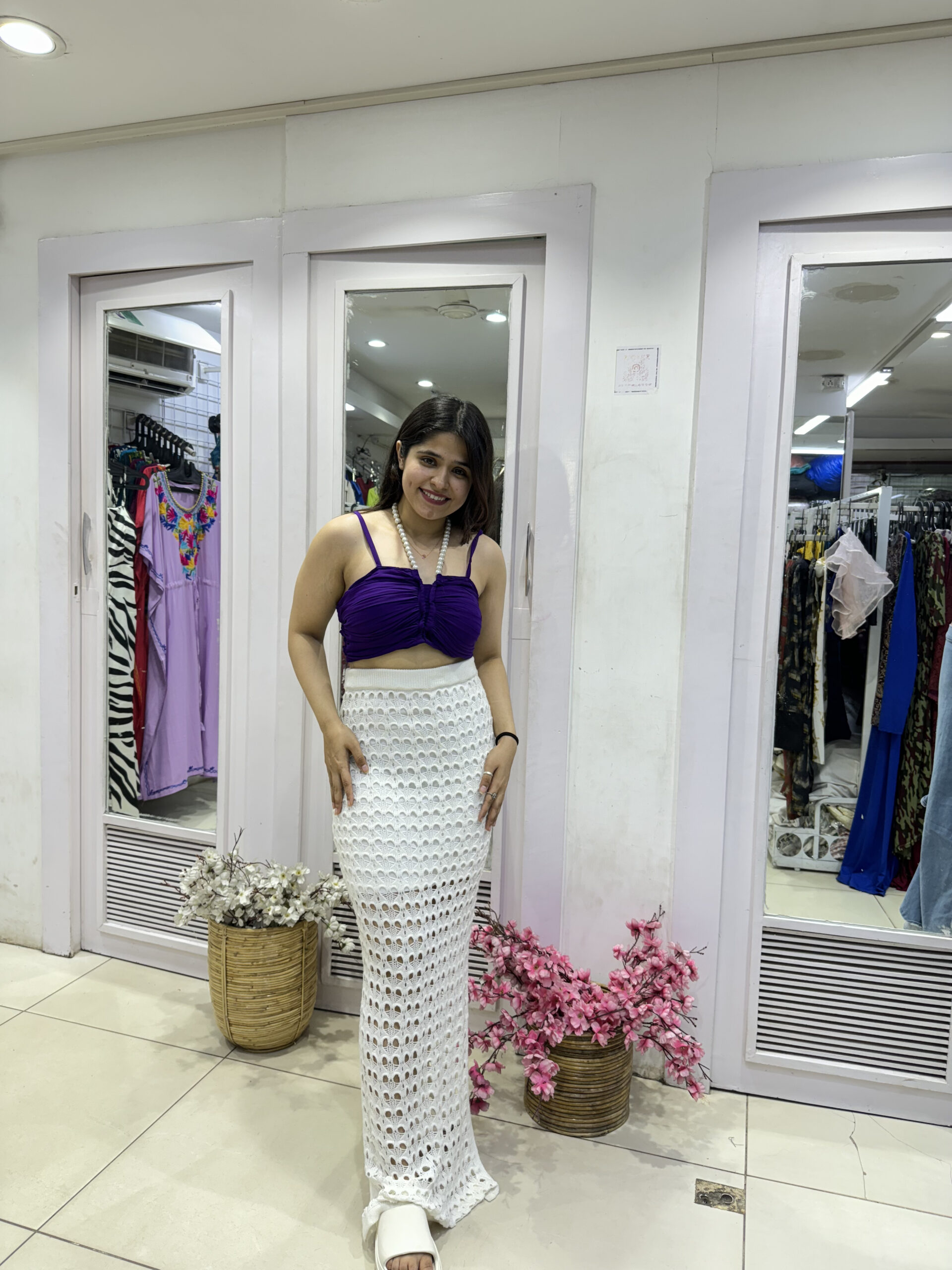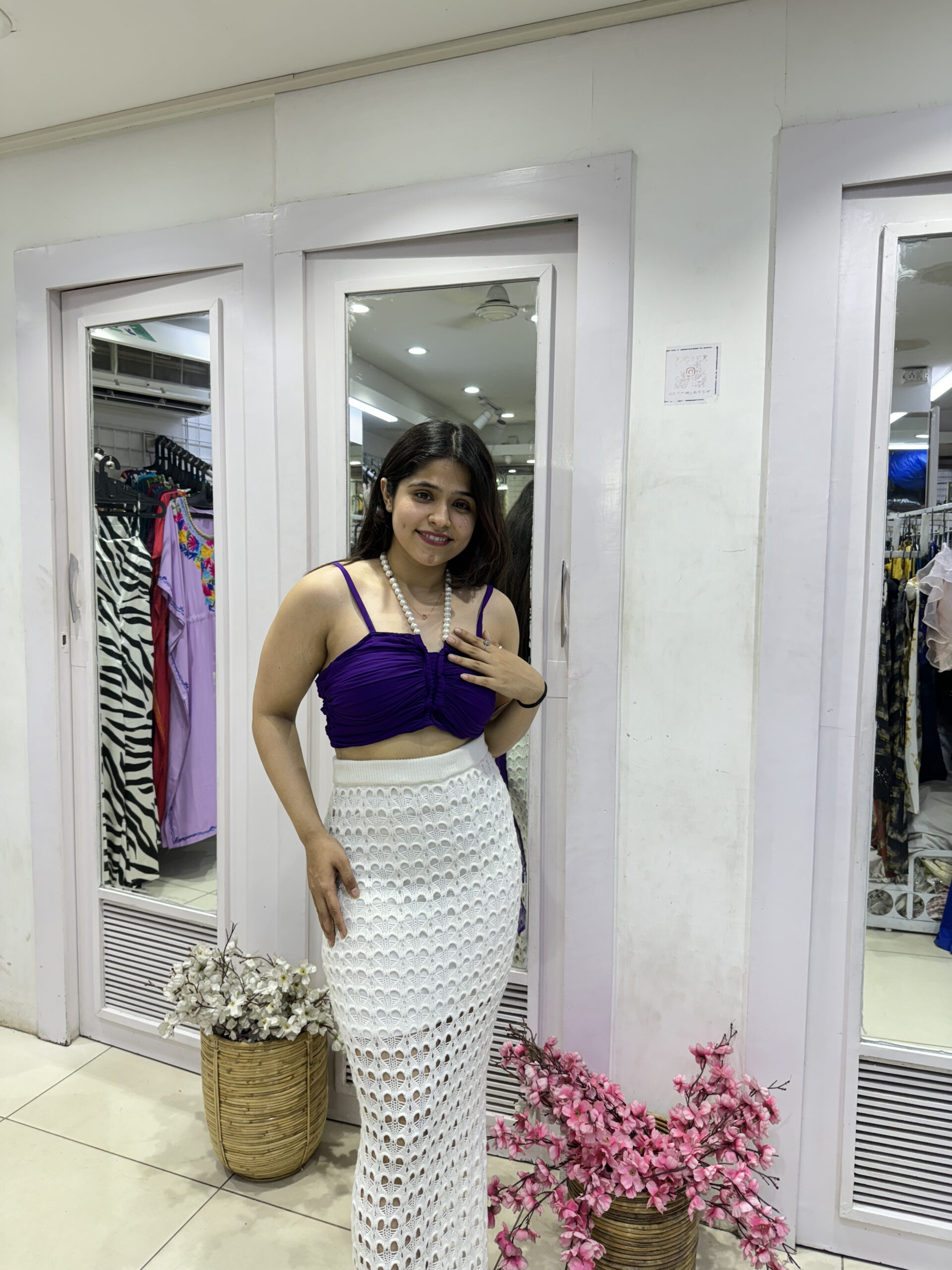 Stylish purple ruched top with delicate pearl straps and a chic back bow, paired with a white crochet skirt. The pearl detailing adds charm while the crochet gives it a breezy vibe—perfect for vacations and beach getaways.”