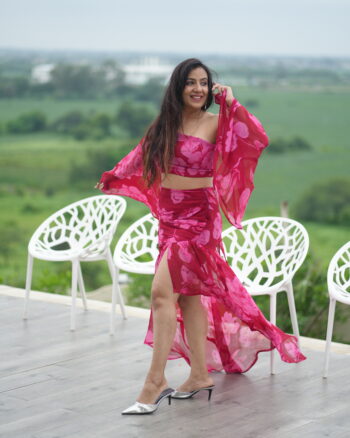 One-shoulder chiffon co-ord in bold red with pink florals and slit skirt — perfect for vacation glam and photoshoots.