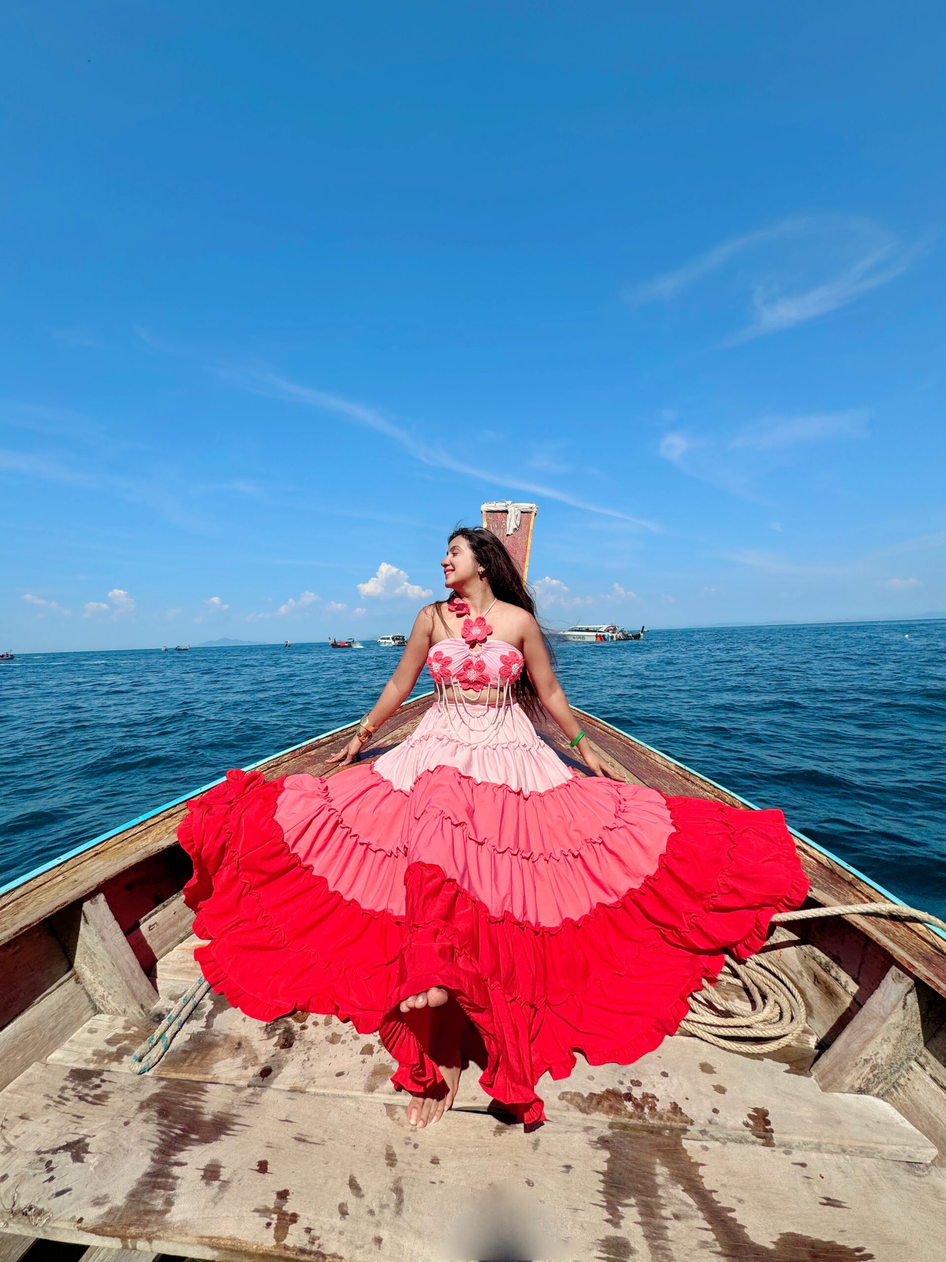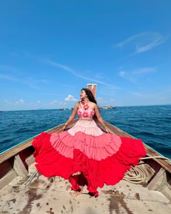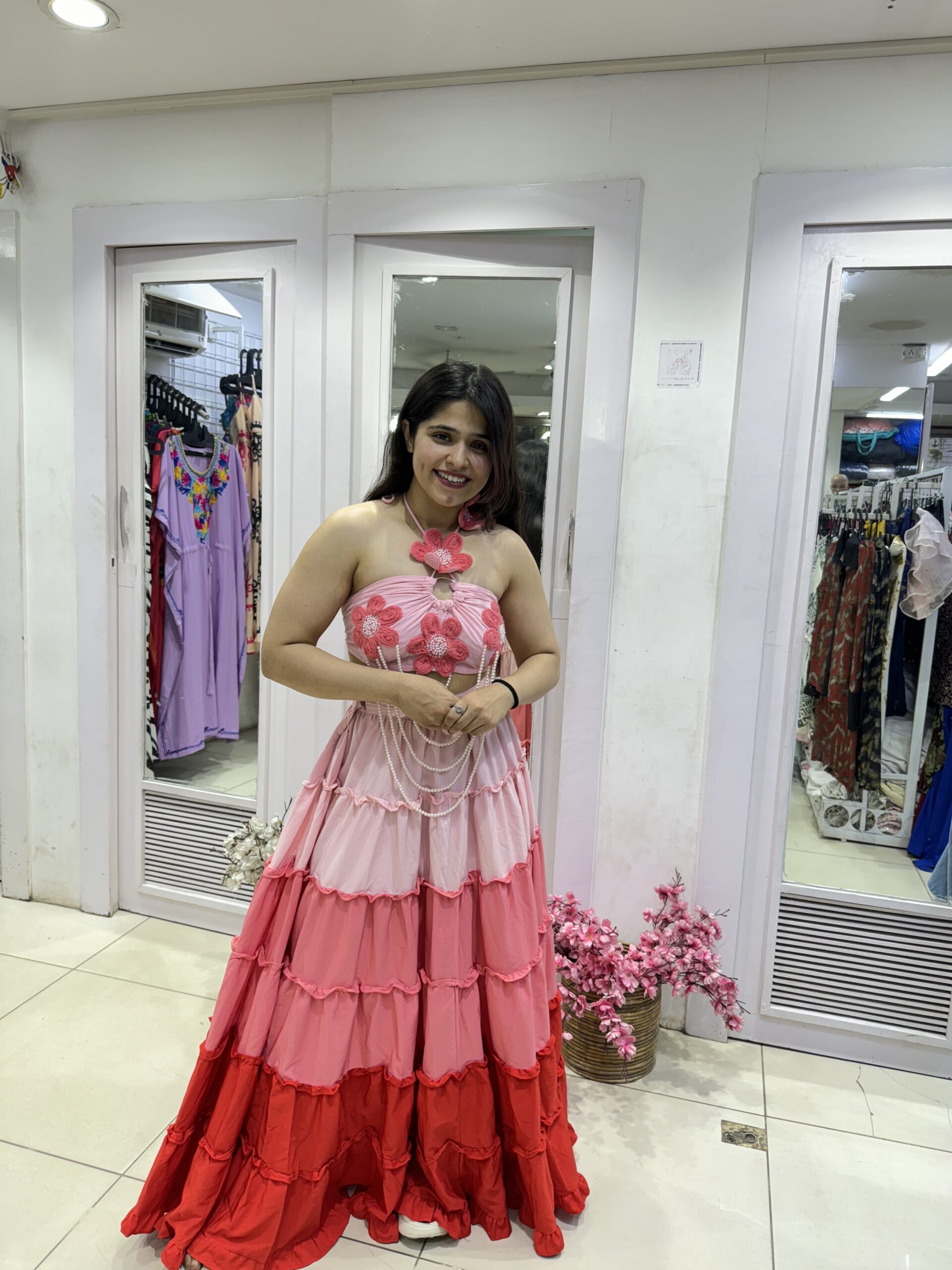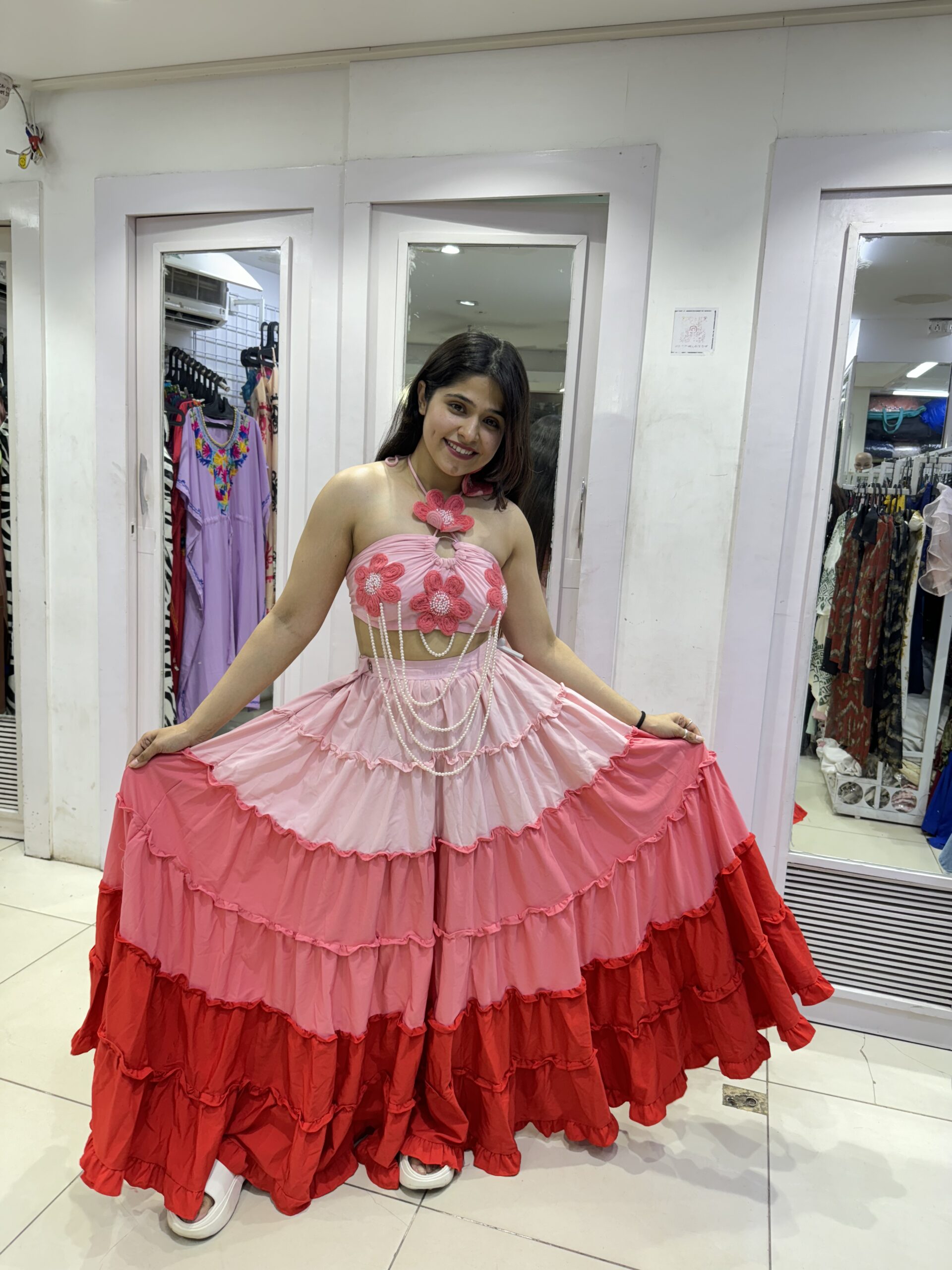 Customised layered skirt with floral bralette and pearl chains — perfect for vacation photoshoots and stylish pool parties
