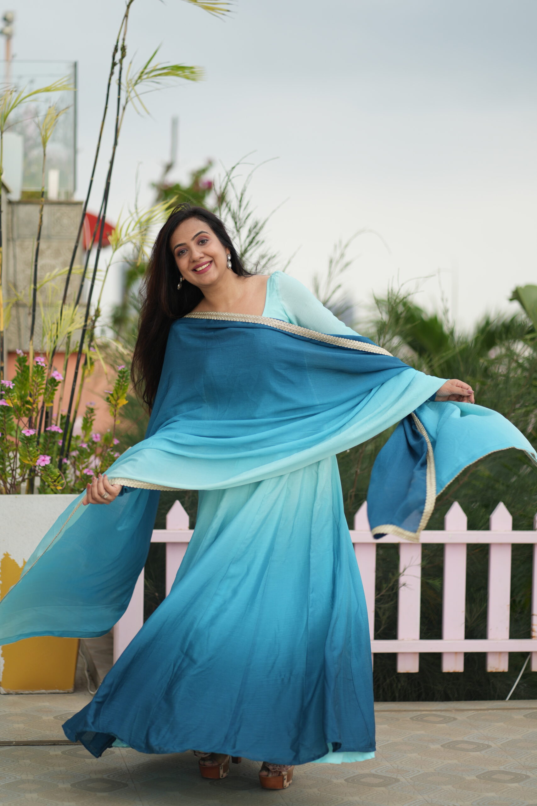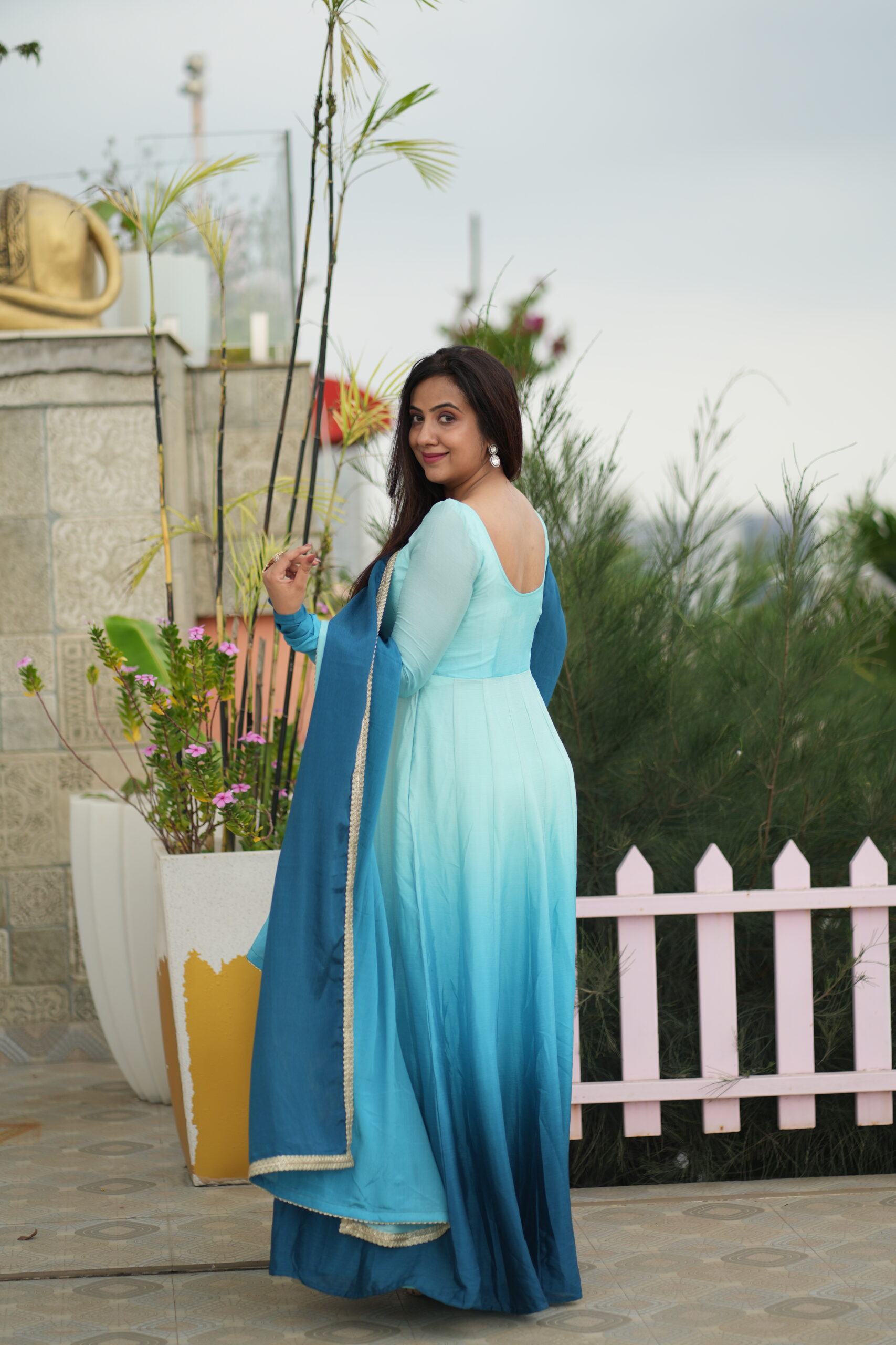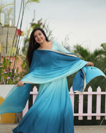Pure chinnon blue ombré dress with golden border, giving fresh and festive vibes.