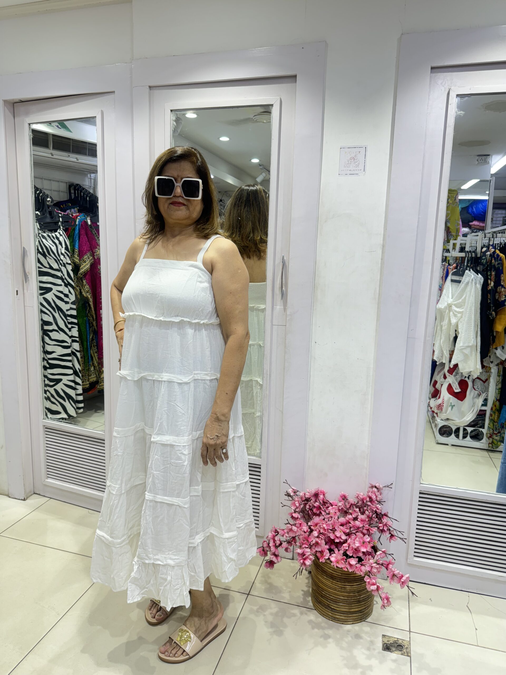 Breezy pure cotton tiered dress in classic white — perfect for vacation strolls and summer comfort.